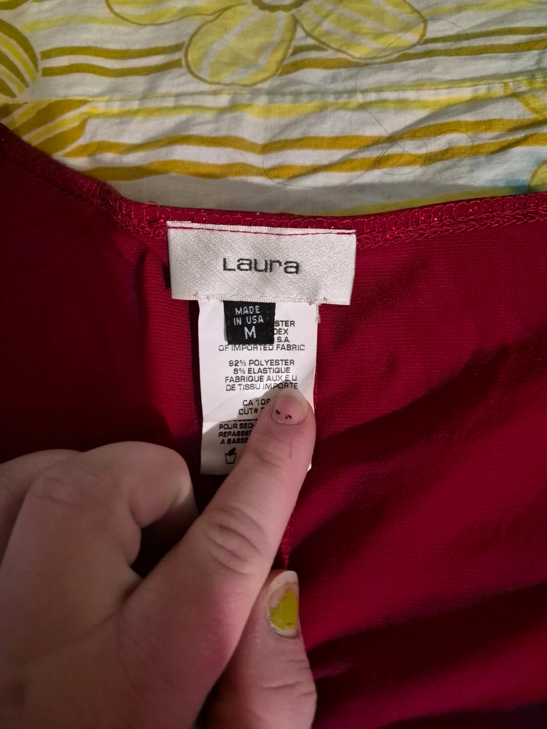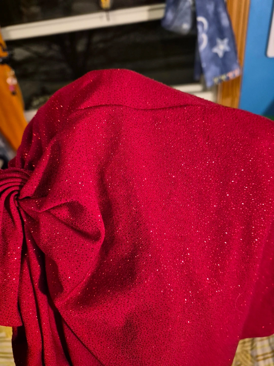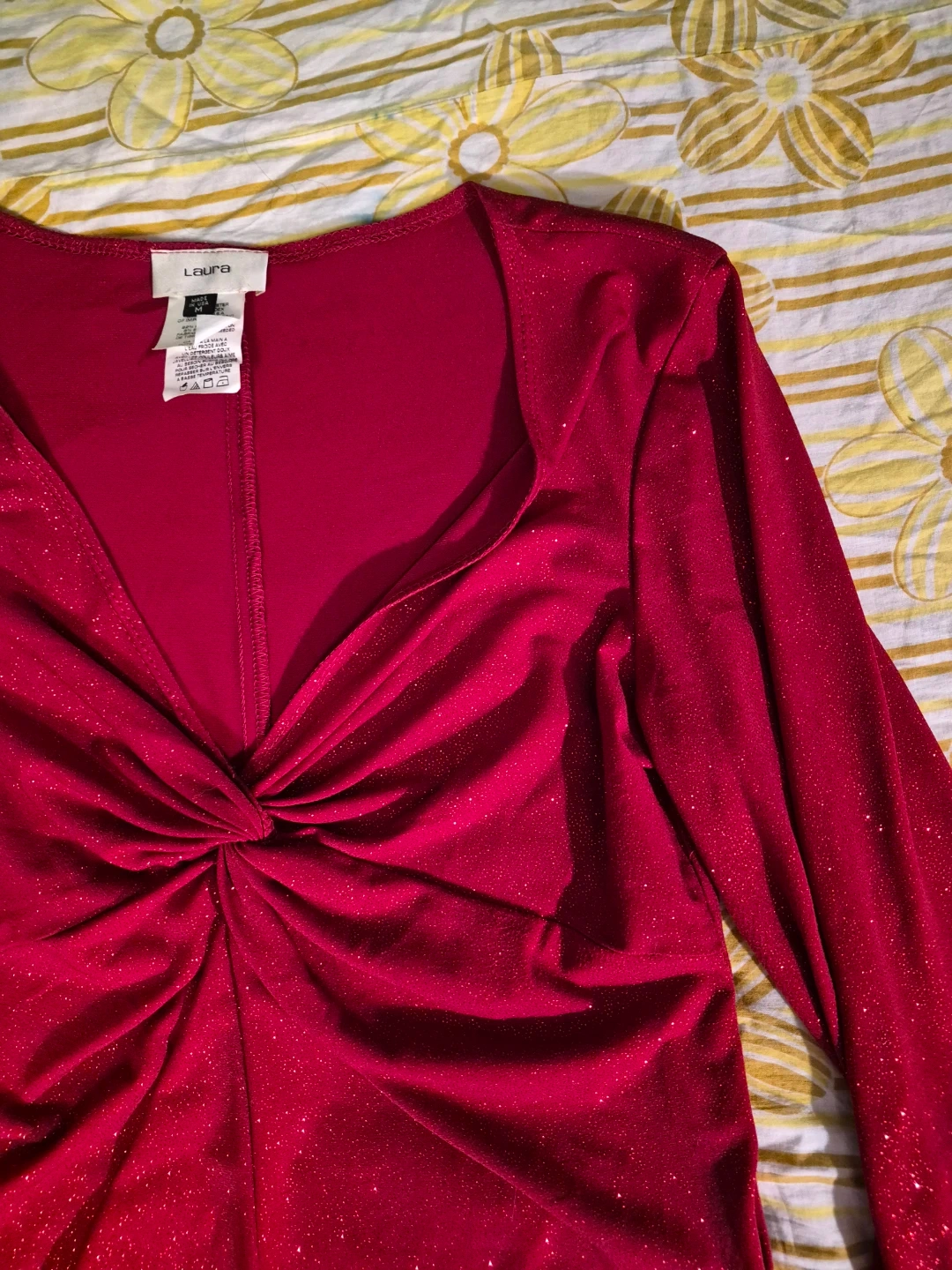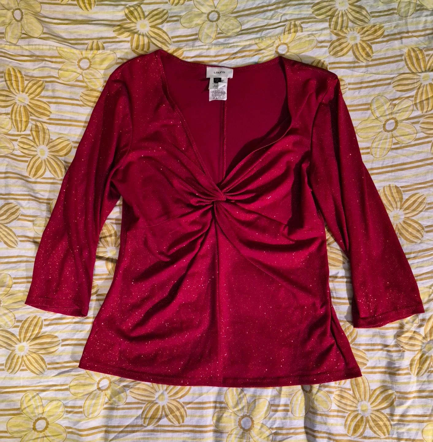 adorable y2k red sparkly twist front 3/4 sleeve party top by Laura. this shirt is so sparkly I couldn't photograph just how many sparkles there was, pic 8 was an attempt. would be great for a holiday party (Christmas, Lunar New Year, think red!) or everyday wear.