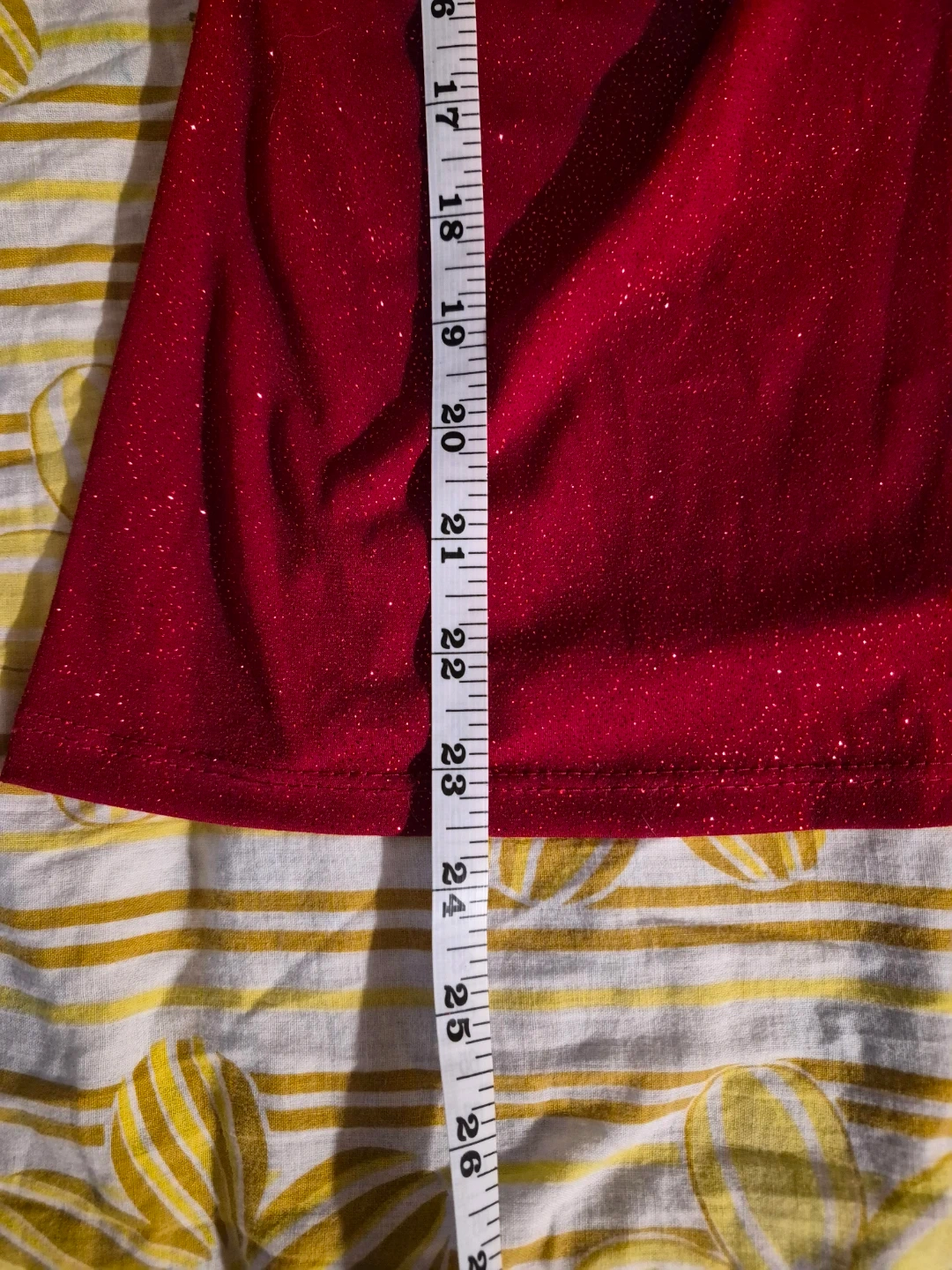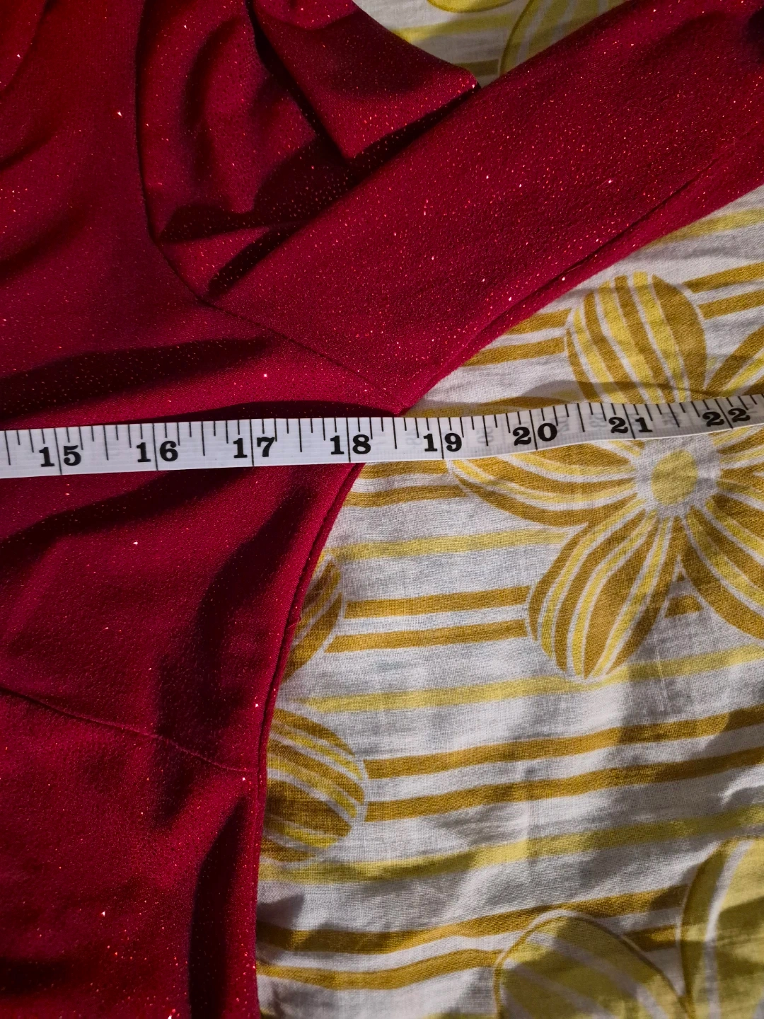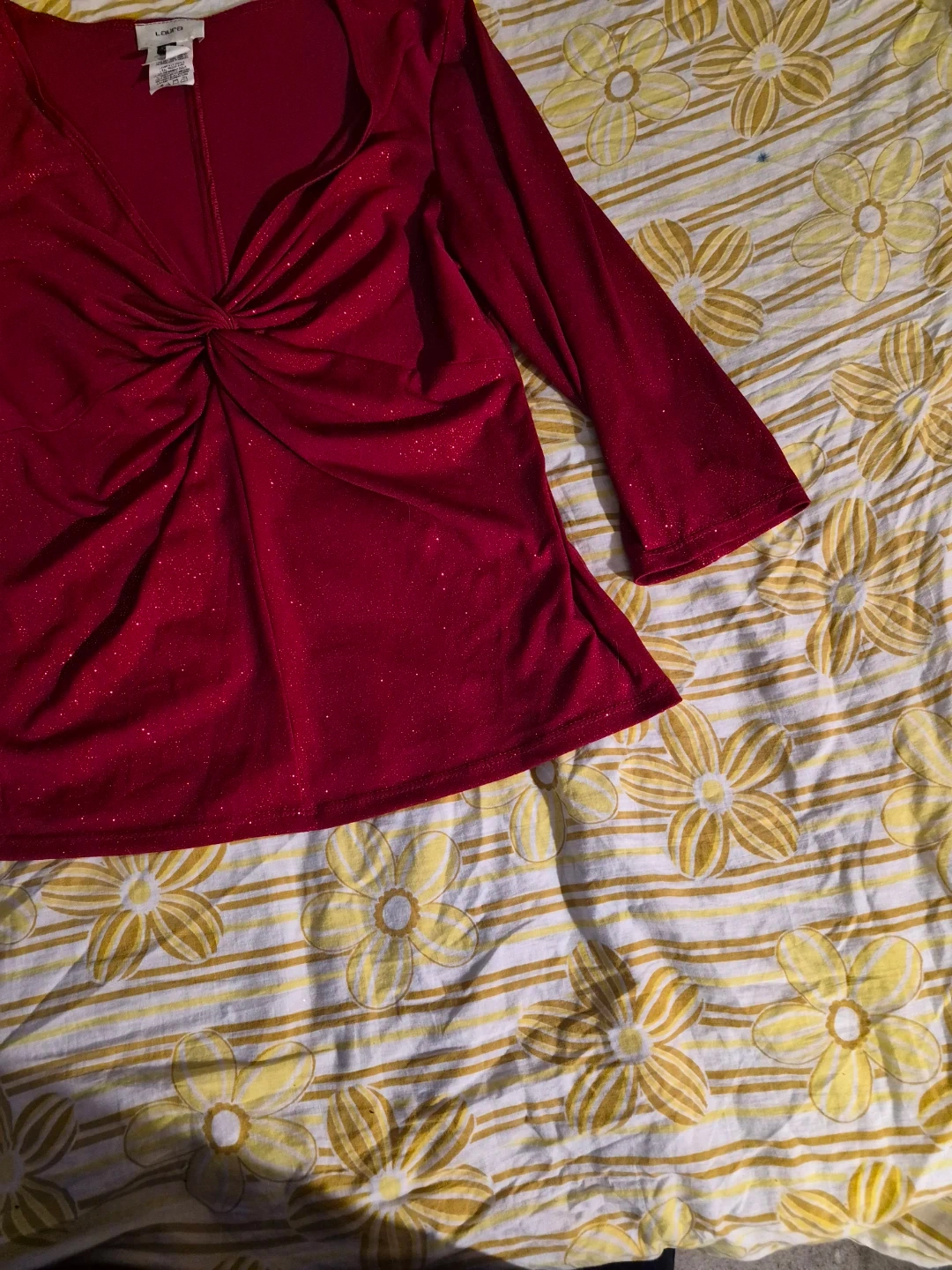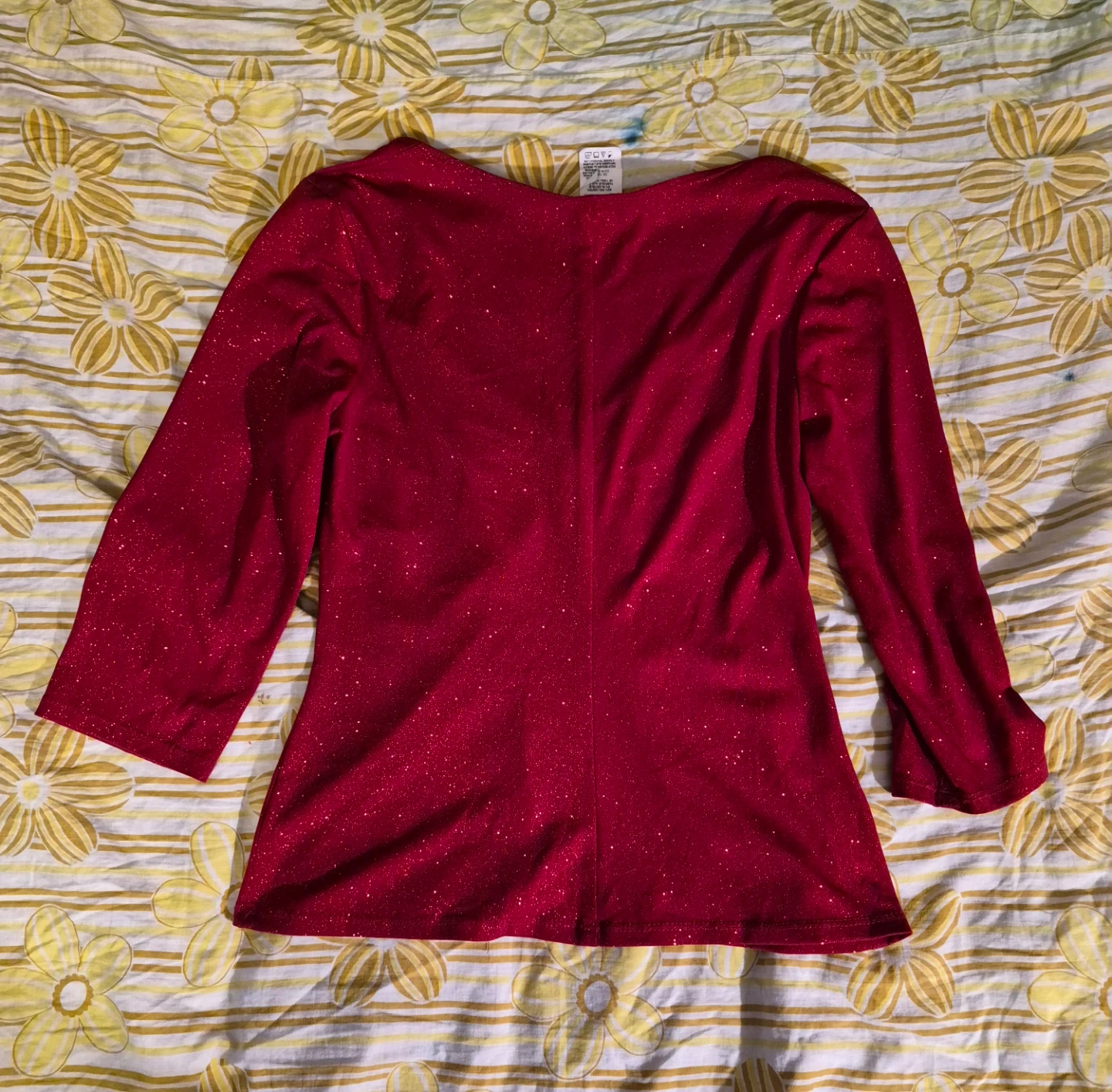 adorable y2k red sparkly twist front 3/4 sleeve party top by Laura. this shirt is so sparkly I couldn't photograph just how many sparkles there was, pic 8 was an attempt. would be great for a holiday party (Christmas, Lunar New Year, think red!) or everyday wear.