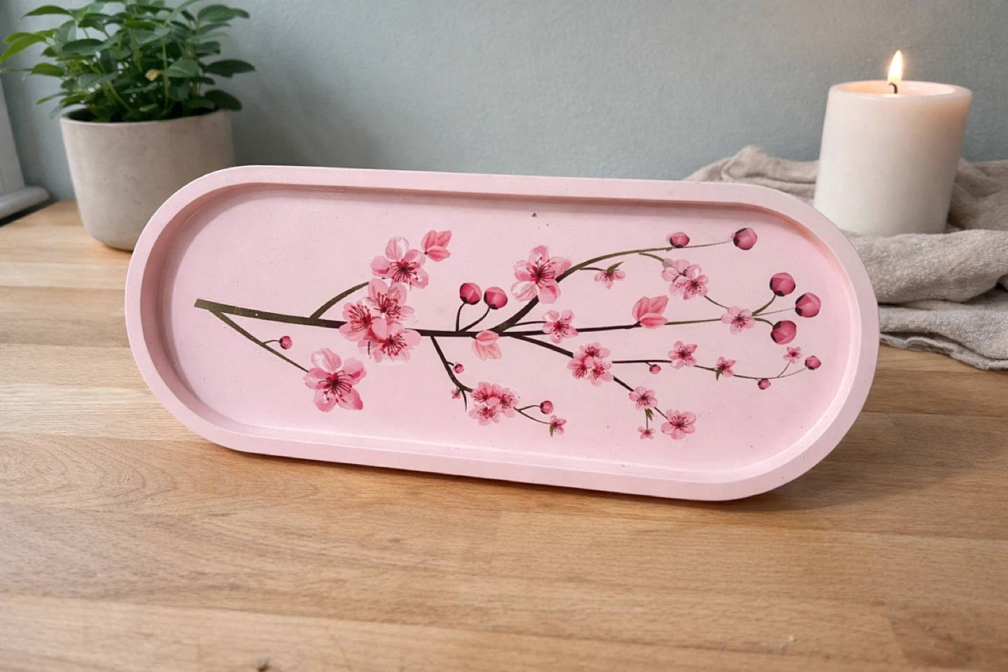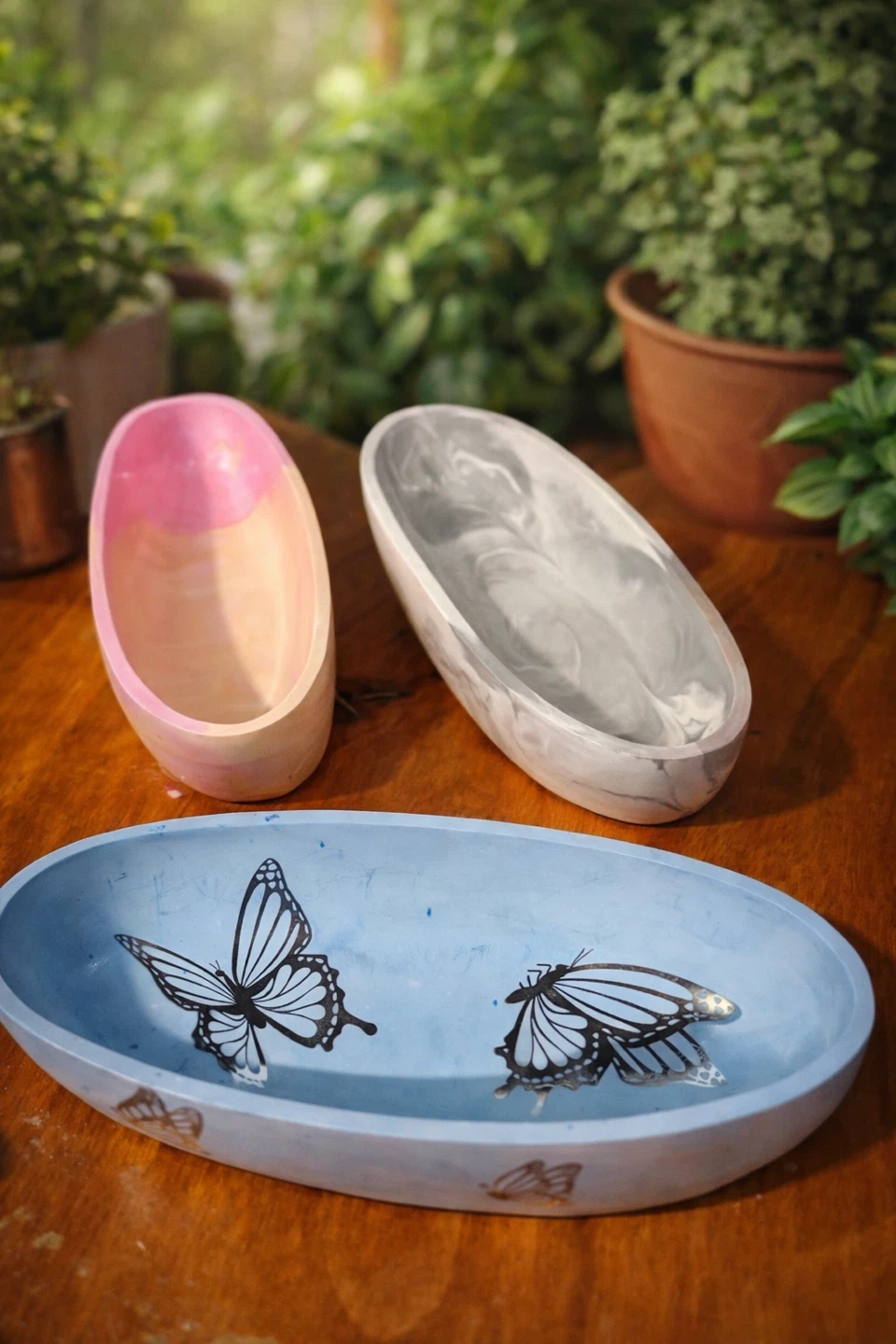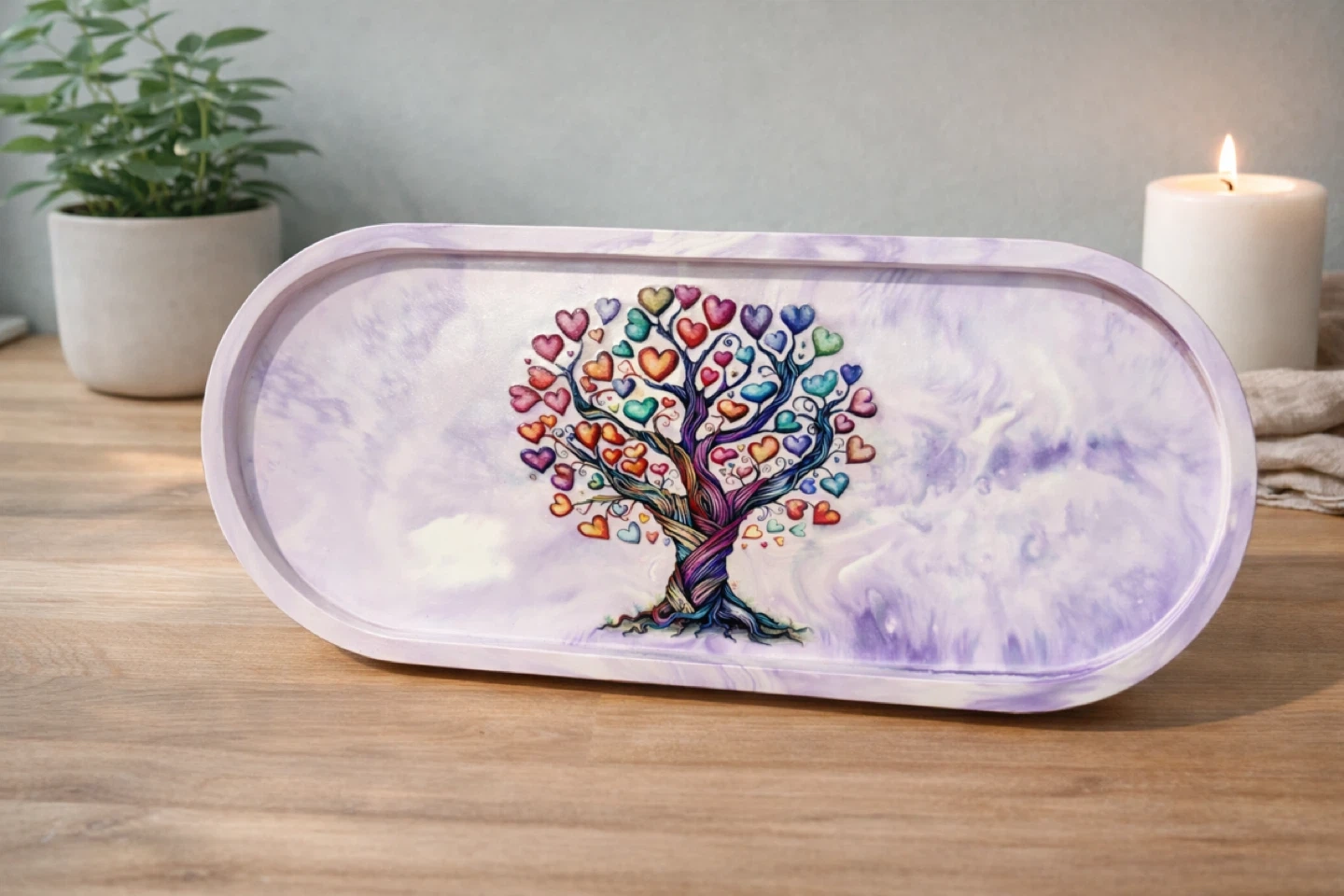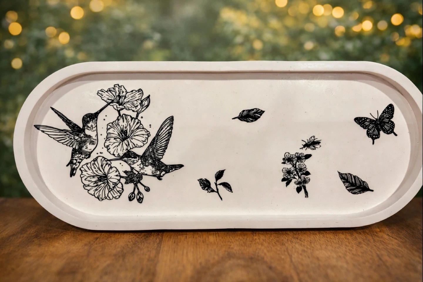 This oval tray and bowl is made of a durable eco resin material. It's perfect for holding small trinkets, keys, or jewelry. Several designs are available, including floral patterns and whimsical trees. $15 with matching pen/makeup brush cup