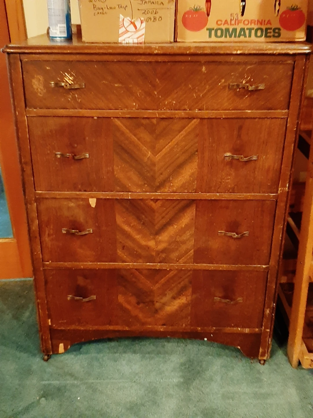 This is a vintage dresser made of wood. It features four drawers with decorative chevron patterns. The dresser has a rich brown finish and brass-coloured hardware. It's a sturdy piece for bedroom storage.needs some work on feet.