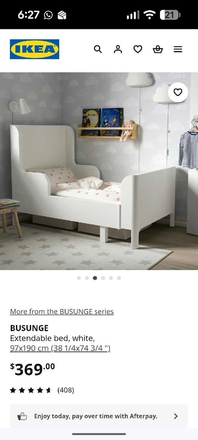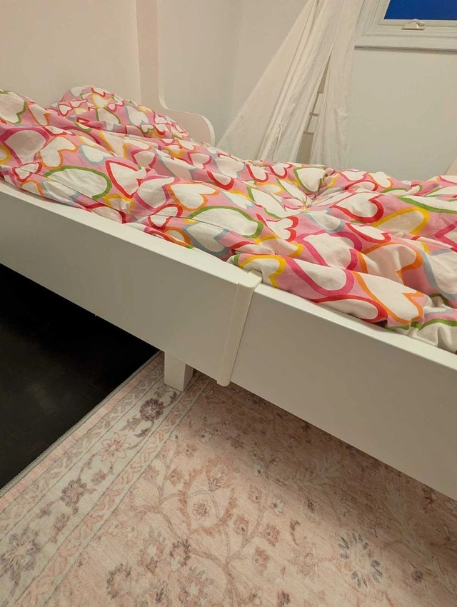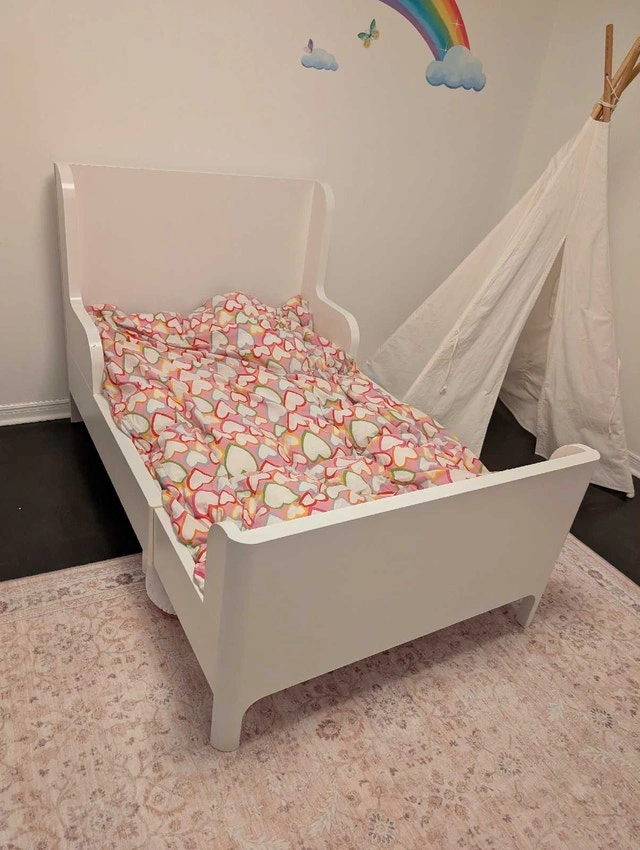 This toddler bed from Ikea is perfect for transitioning your little one from a crib! The bed is also adjustable. It's in good condition, ready to bring sweet dreams to its next owner. I've loved this bed, and I'm sure your child will too! I actually have 2 identical beds available. Let's make bedtime a bit more magical, shall we?