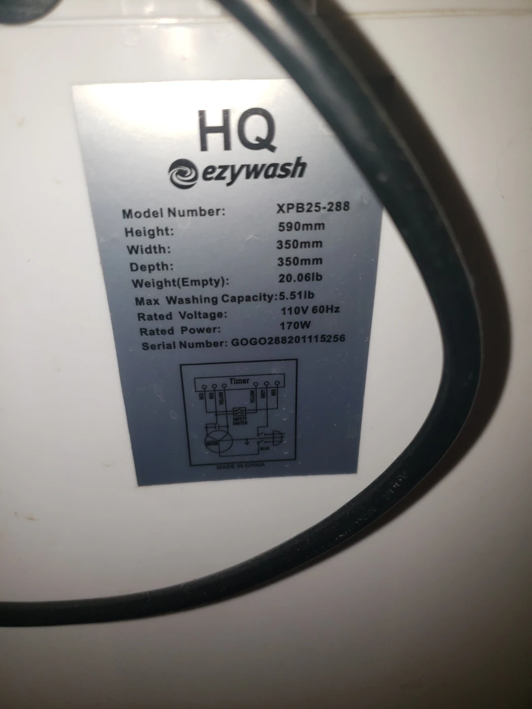 HQ ezywash portable washing machine, model XPB25-288. It has a max washing capacity of 5.51lb. Rated voltage is 110V-60Hz with a rated power of 170W. This compact washer is great for small loads and apartments!