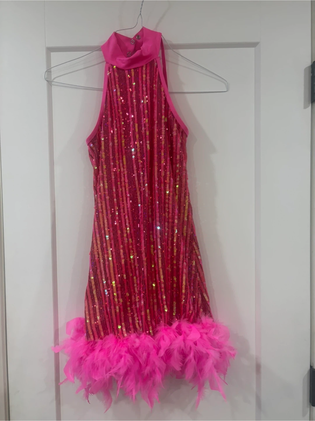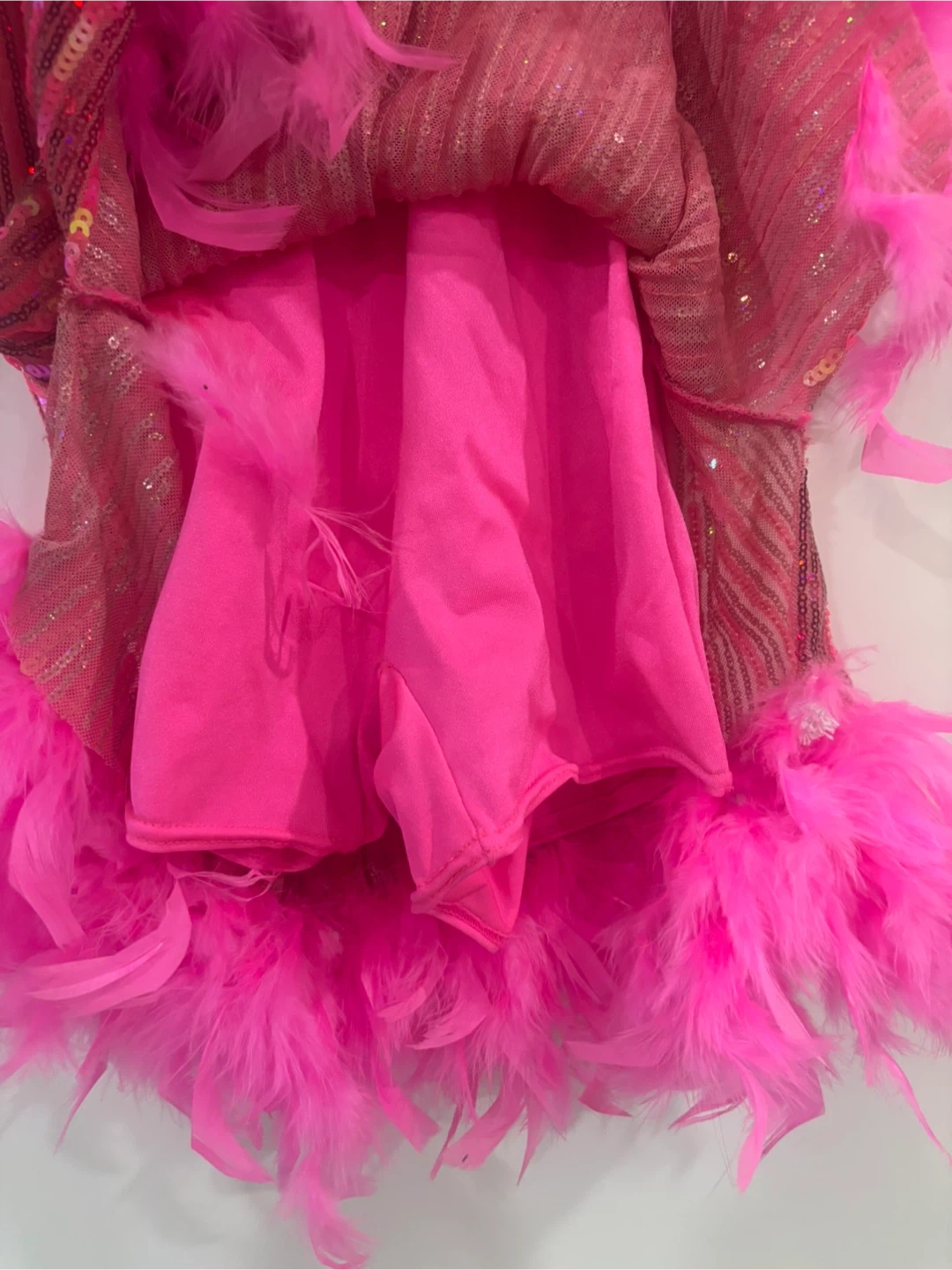 Sparkly pink halter costume with sequin detailing and a fluffy feather trim. It has built-in shorts underneath. Perfect for a dance performance or a fun costume party! Horn for jazz routine.