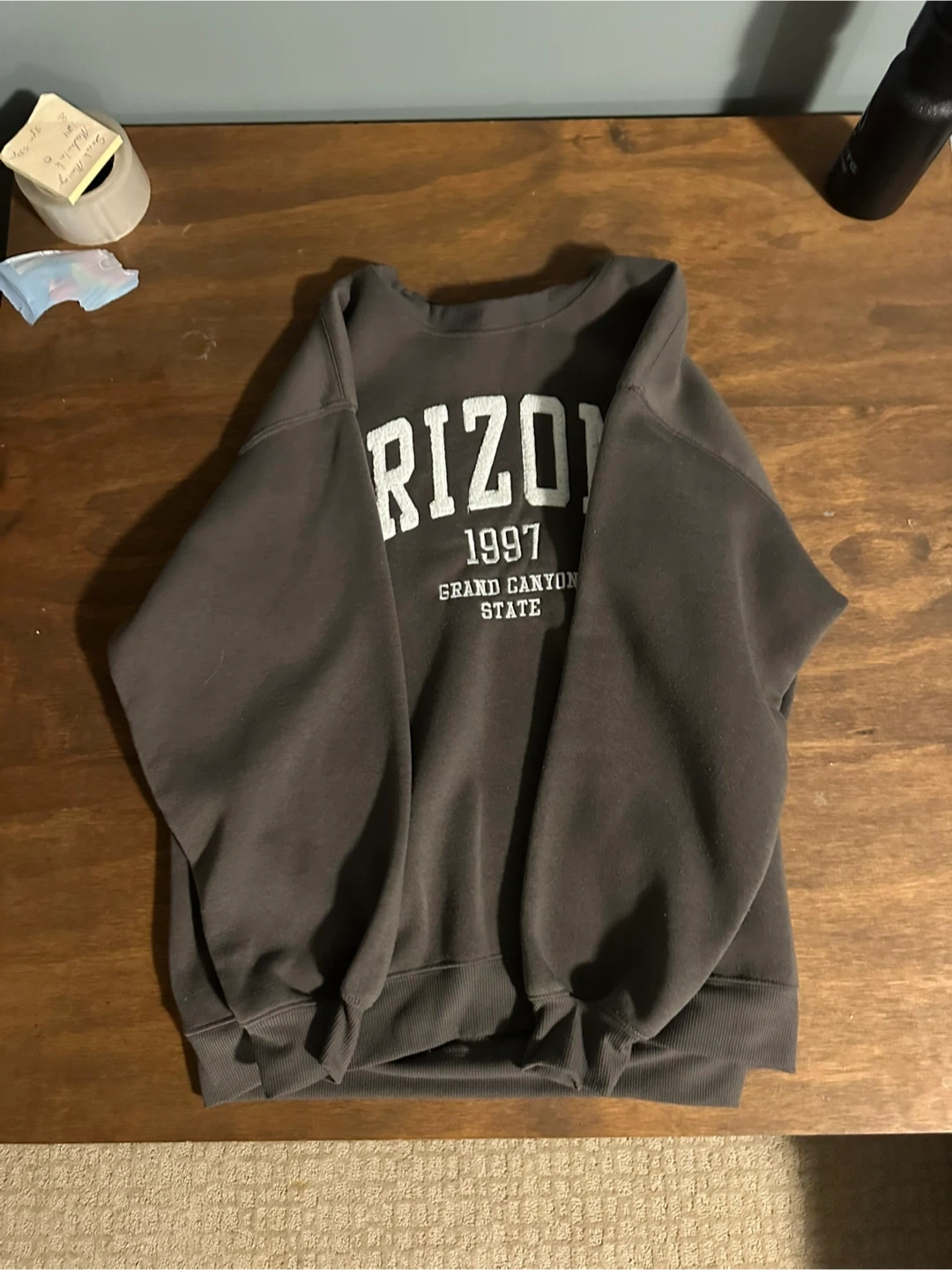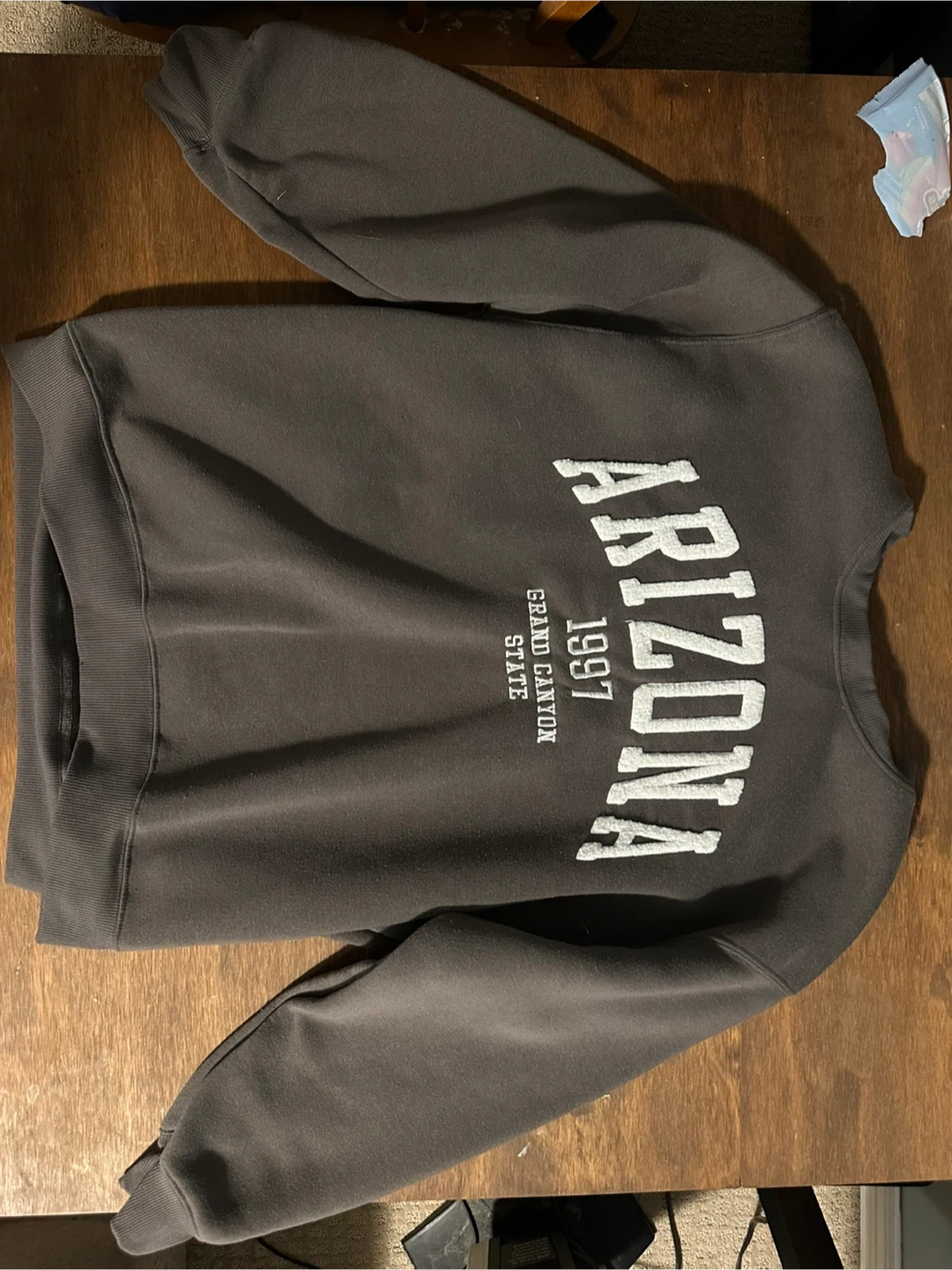 This is a grey sweatshirt with 'Arizona 1997 Grand Canyon State' printed on the front. It's a comfortable, casual piece. Crew neck style with long sleeves.