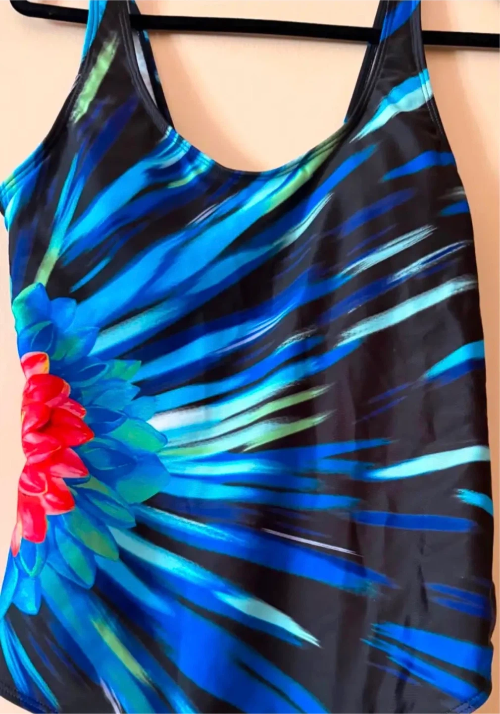 Here's a swimsuit with a cool blue and black floral print! It's in great shape and ready for the pool or beach