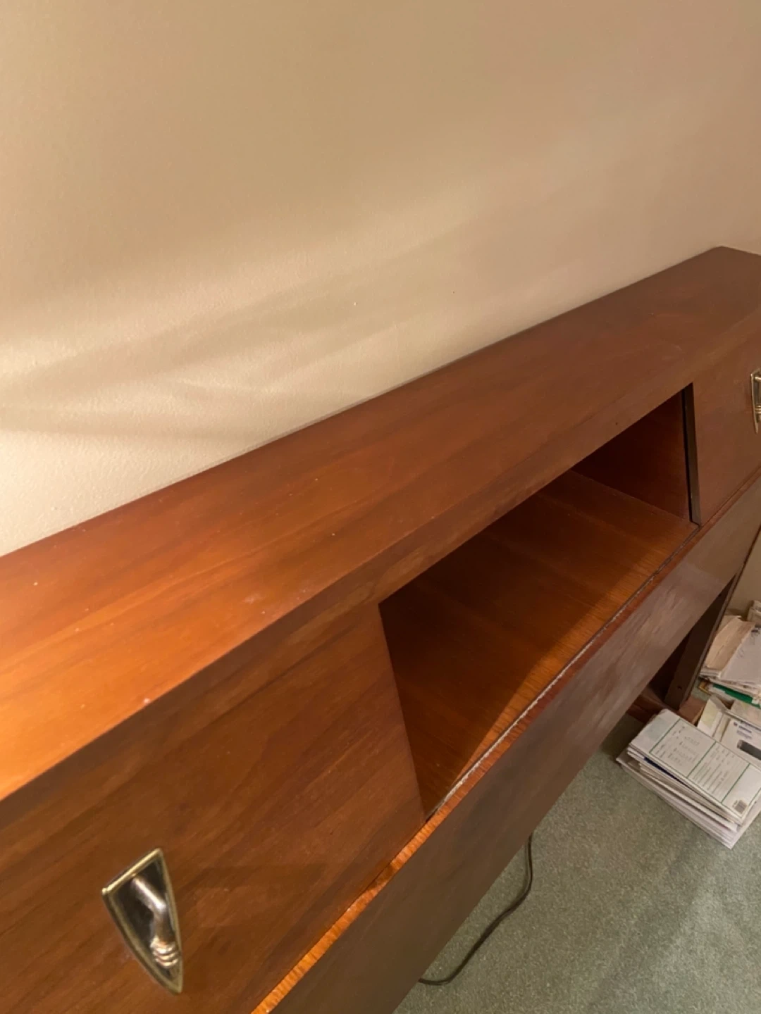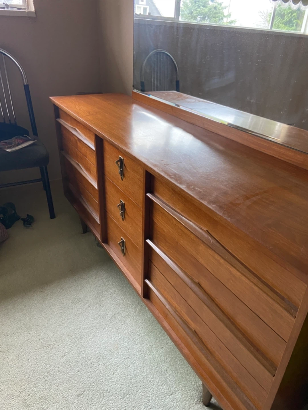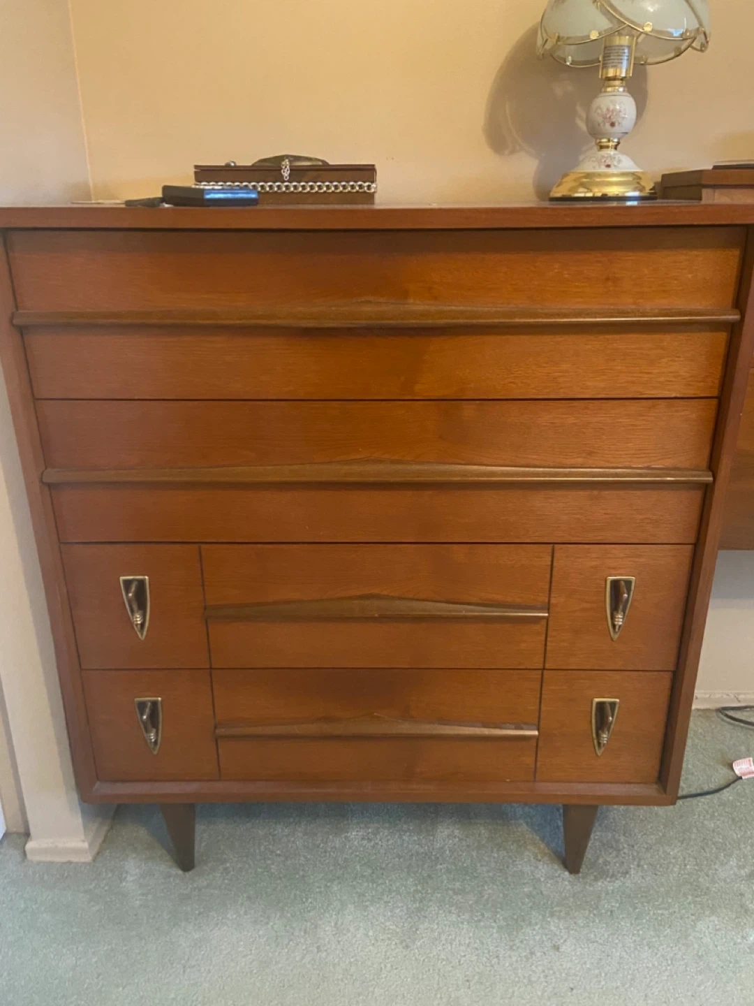 A 3 piece mid-century 1960’s style bedroom set, made of warm-toned wood. It features several drawers with unique metal pulls. A matching mirror attaches to the top. This piece would be a stylish addition to any bedroom.