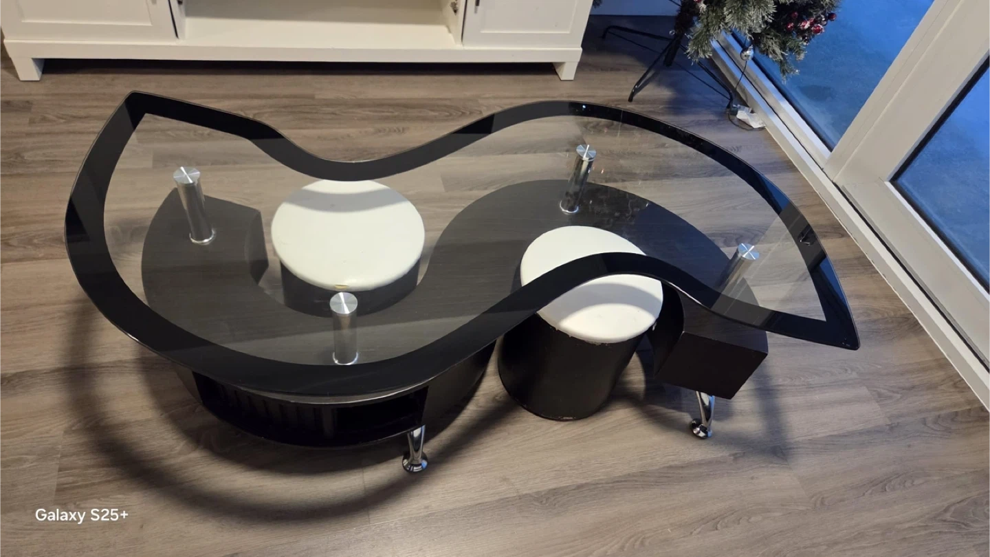 A unique S-shaped coffee table featuring a tempered glass top with a black trim. It has a black base with two circular white accent platforms. This table adds a modern touch to any living space! The glass is durable and easy to clean. It's perfect for holding your drinks and decor.