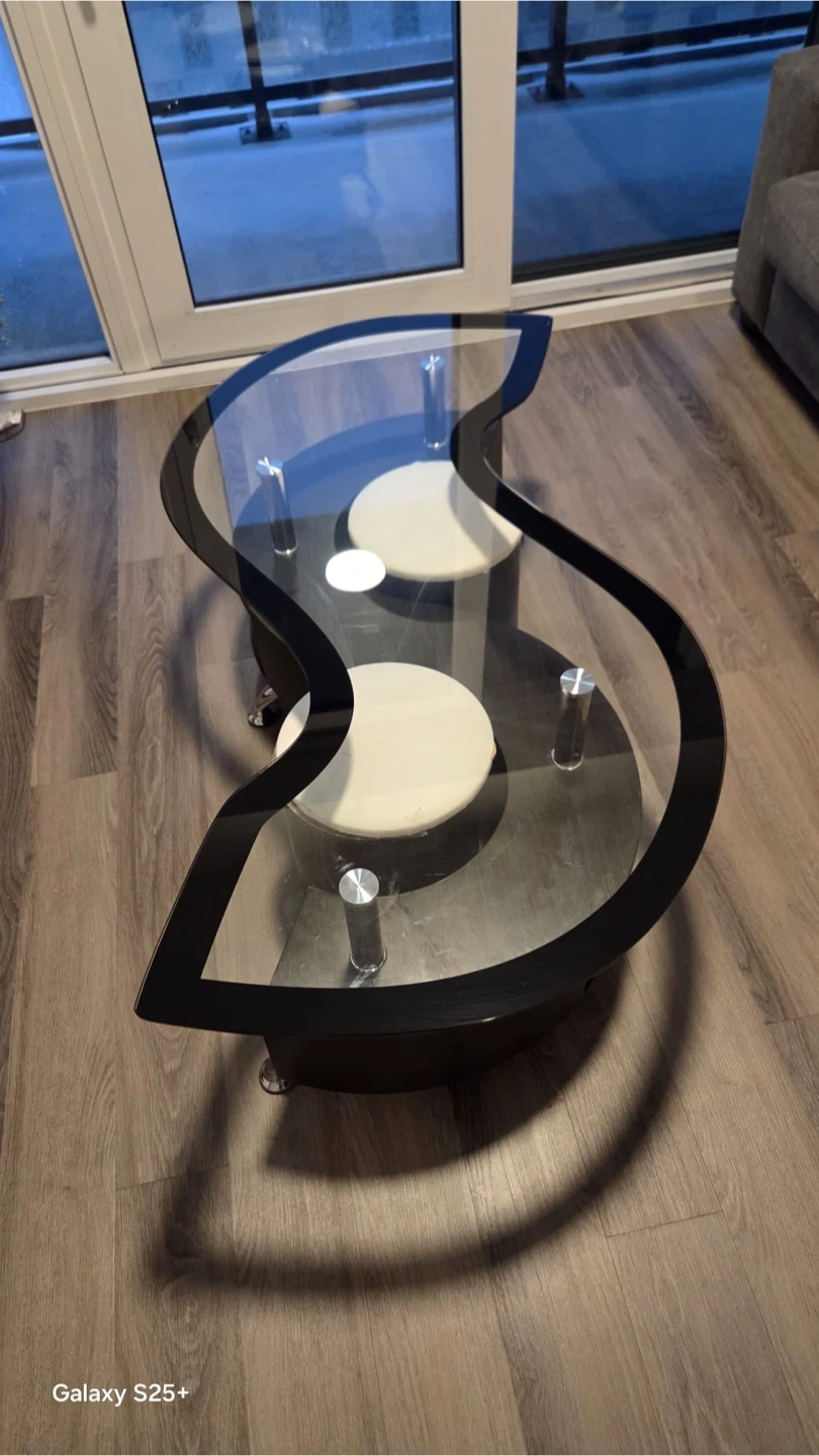 A unique S-shaped coffee table featuring a tempered glass top with a black trim. It has a black base with two circular white accent platforms. This table adds a modern touch to any living space! The glass is durable and easy to clean. It's perfect for holding your drinks and decor.
