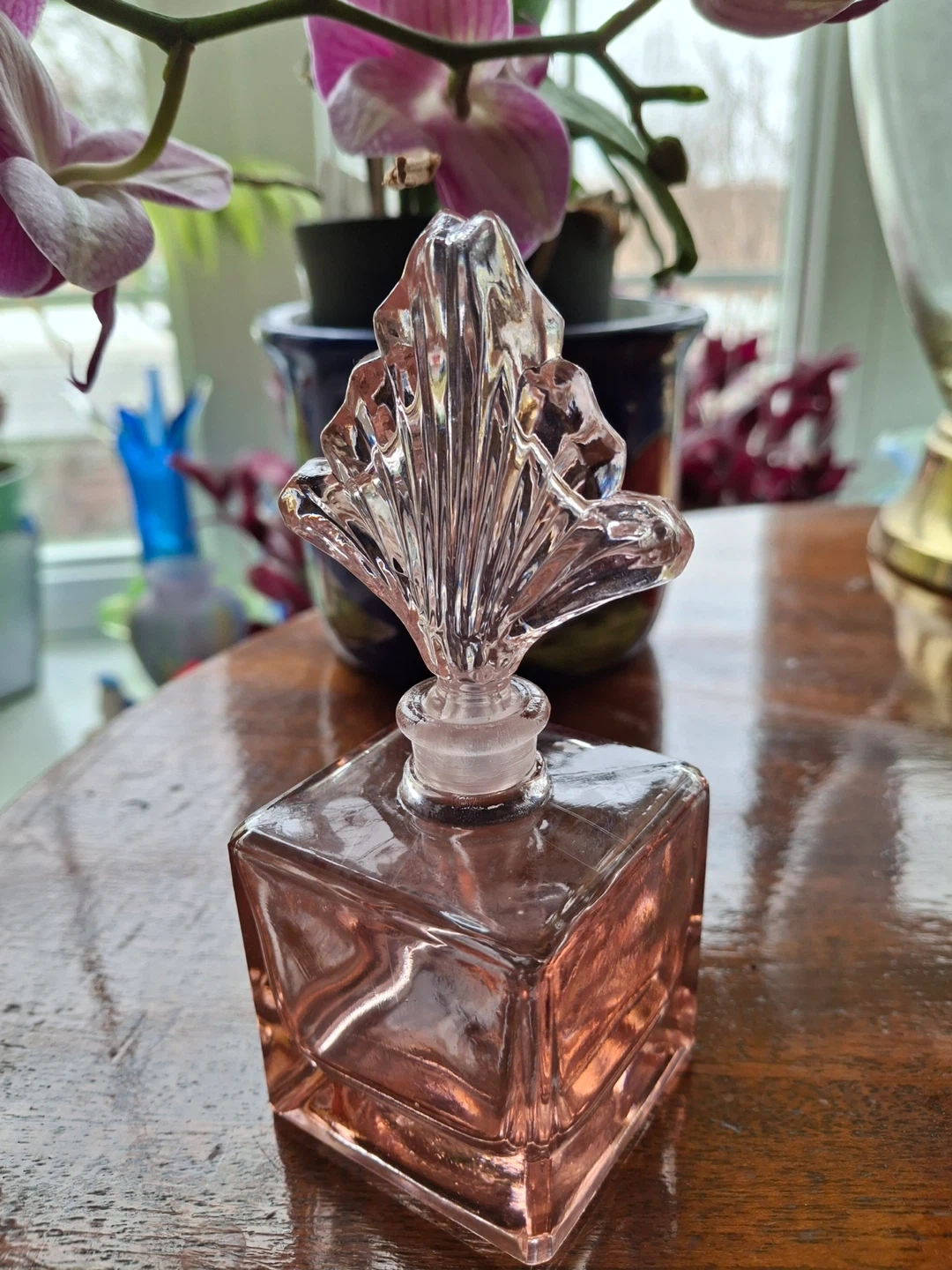 Pink glass perfume bottle with square bottom and pretty fan-like stopper. 5” high and 2” across. Excellent condition.