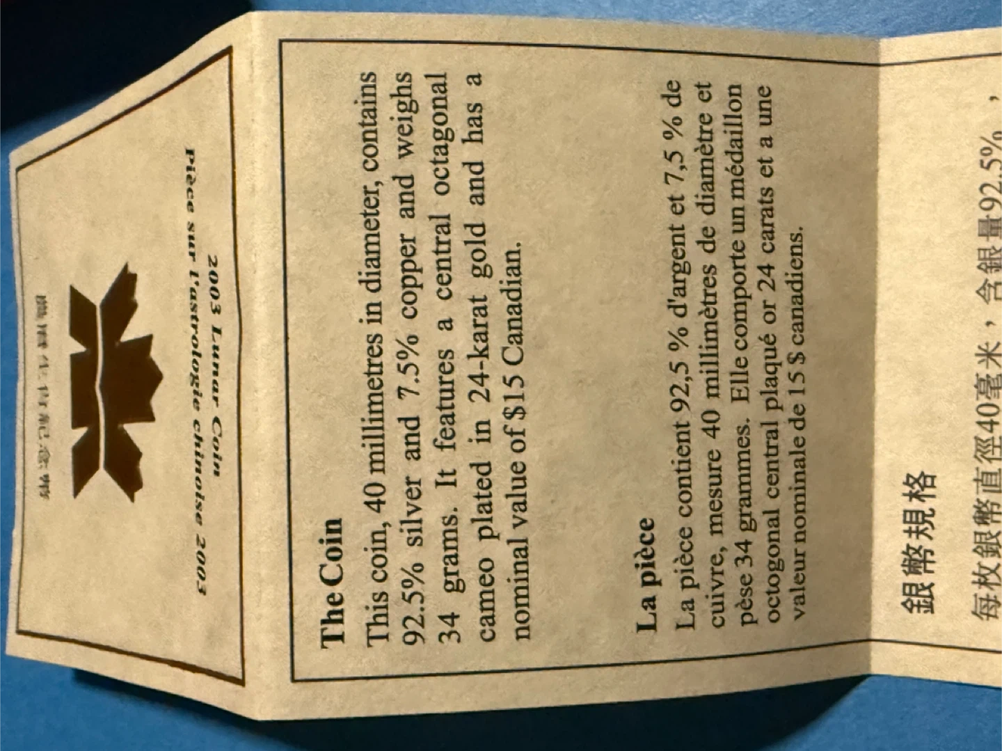 This is a 2003 Canadian Lunar Coin featuring the Year of the Ram. It's 40 millimetres in diameter and weighs 34 grams. It features a central 24-karat gold cameo plated octagon.