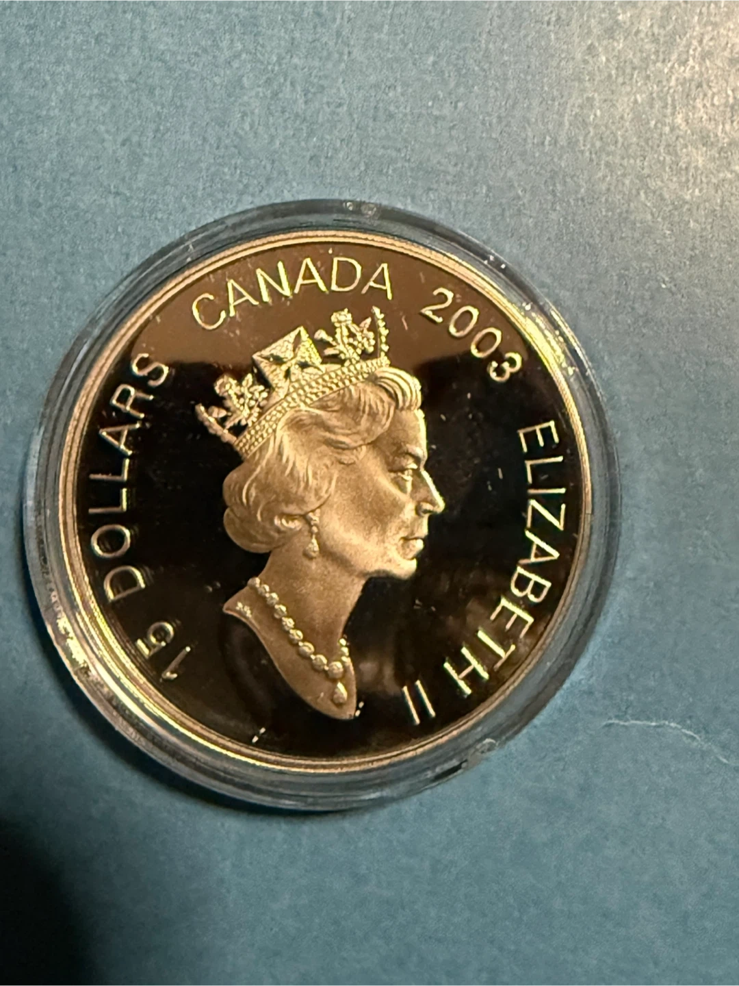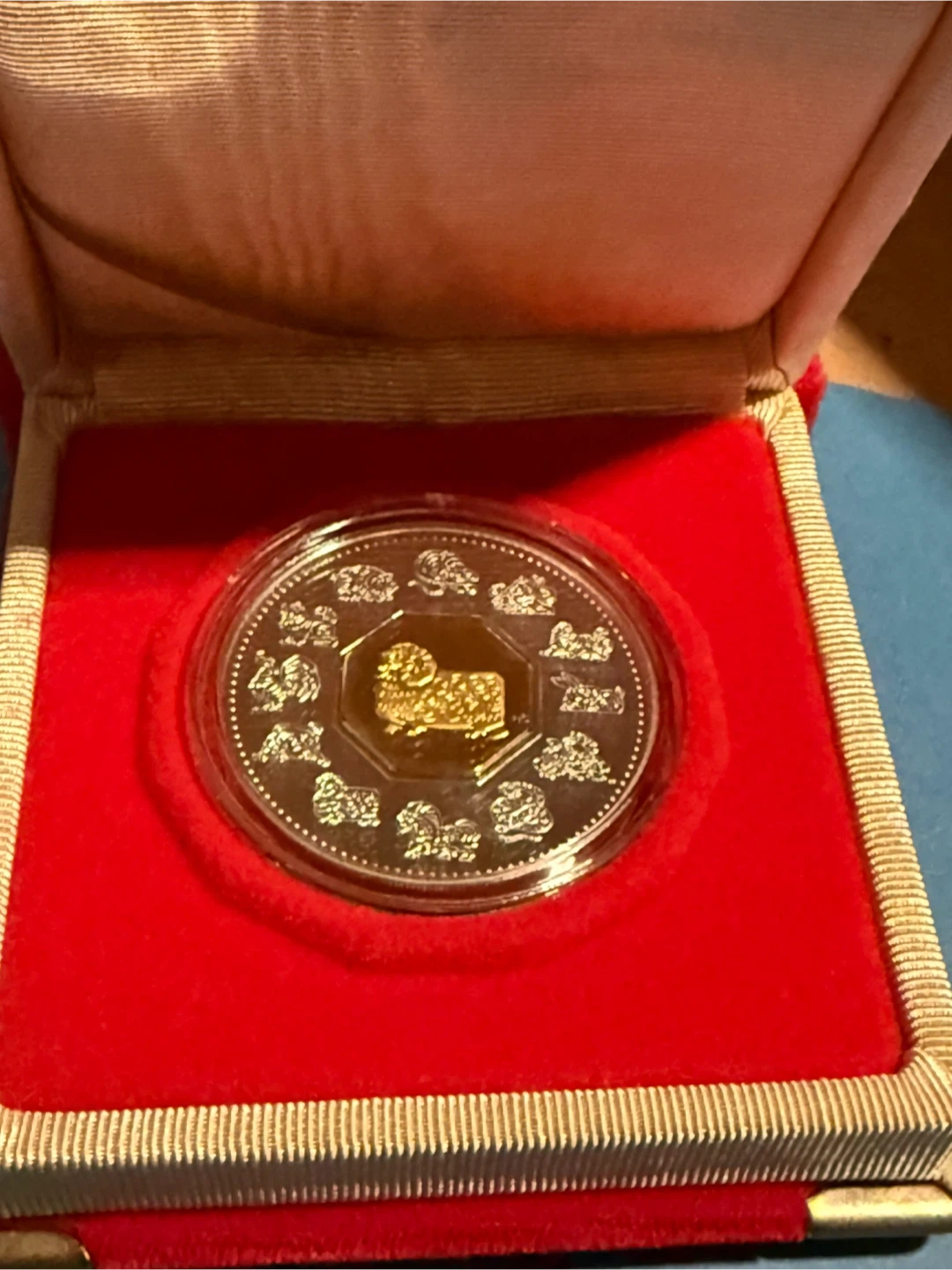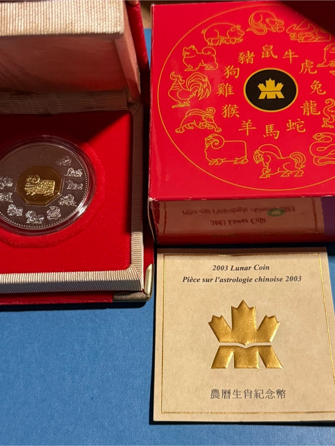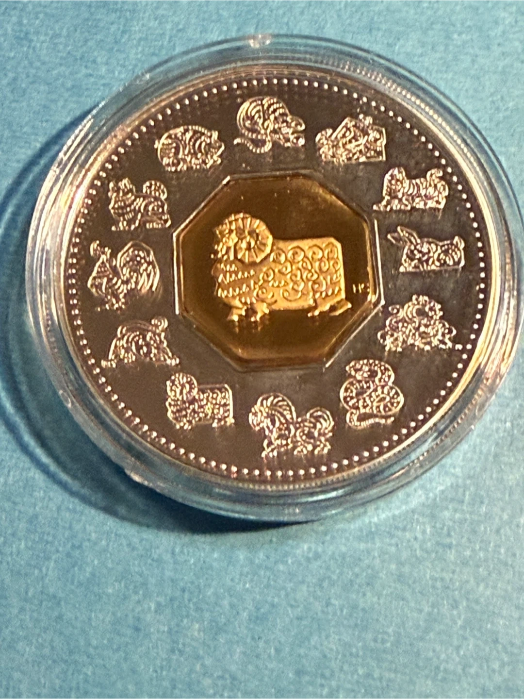 This is a 2003 Canadian Lunar Coin featuring the Year of the Ram. It's 40 millimetres in diameter and weighs 34 grams. It features a central 24-karat gold cameo plated octagon.