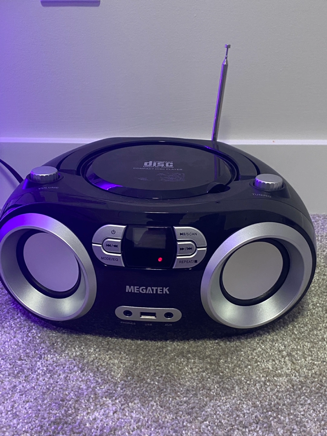 Selling a Megatek CD player! It has a built-in antenna, speakers, and a display screen. It also has AUX, USB, and headphone ports