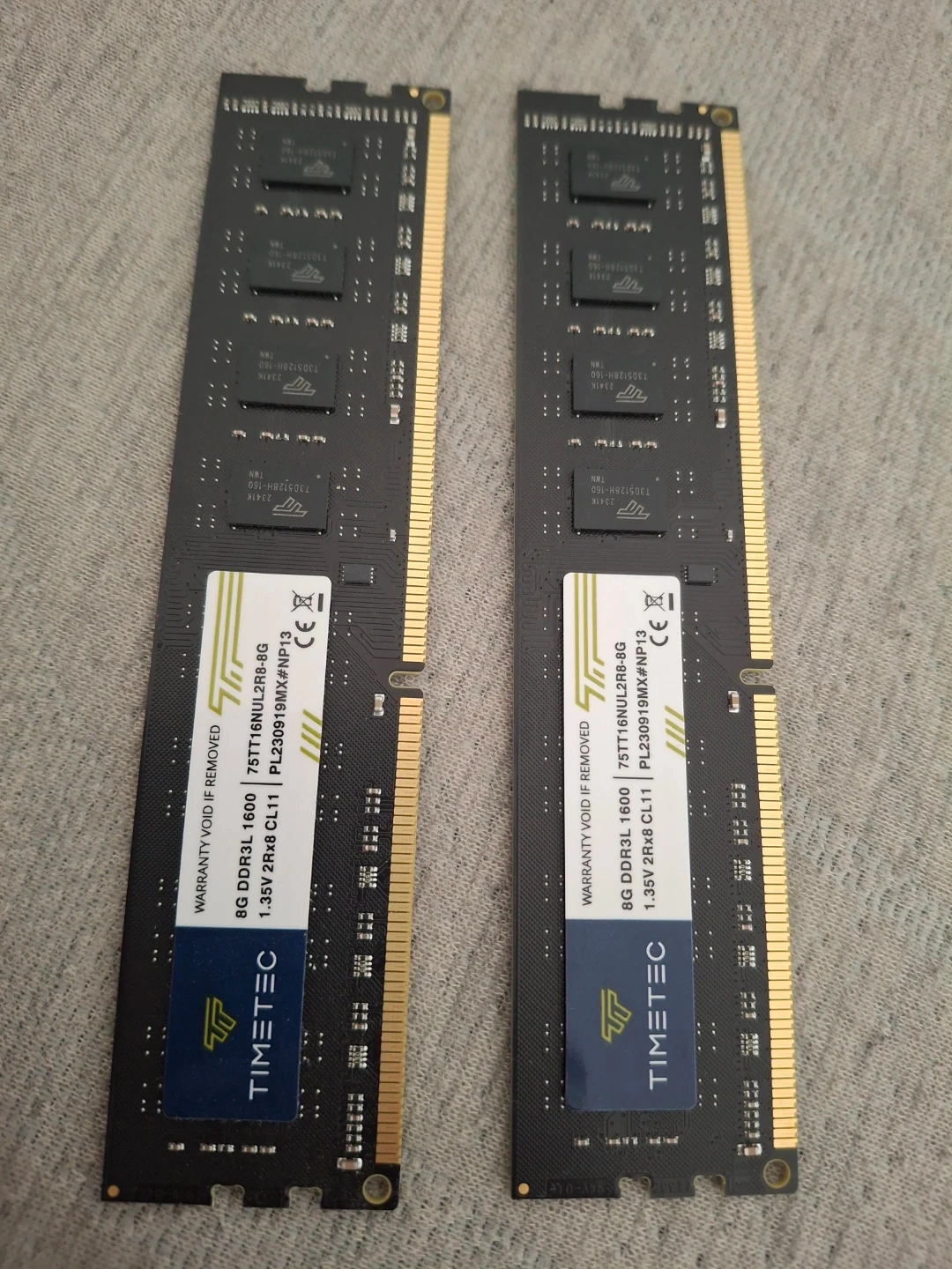 Selling two TIMETEC 8GB DDR3L RAM modules, totaling 16GB. They are rated for 1600MHz speed and run at 1.35V with a CL11 latency. This kit is suitable for desktop computers that support DDR3L memory.