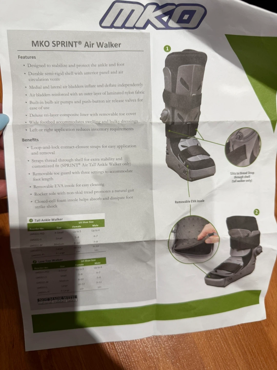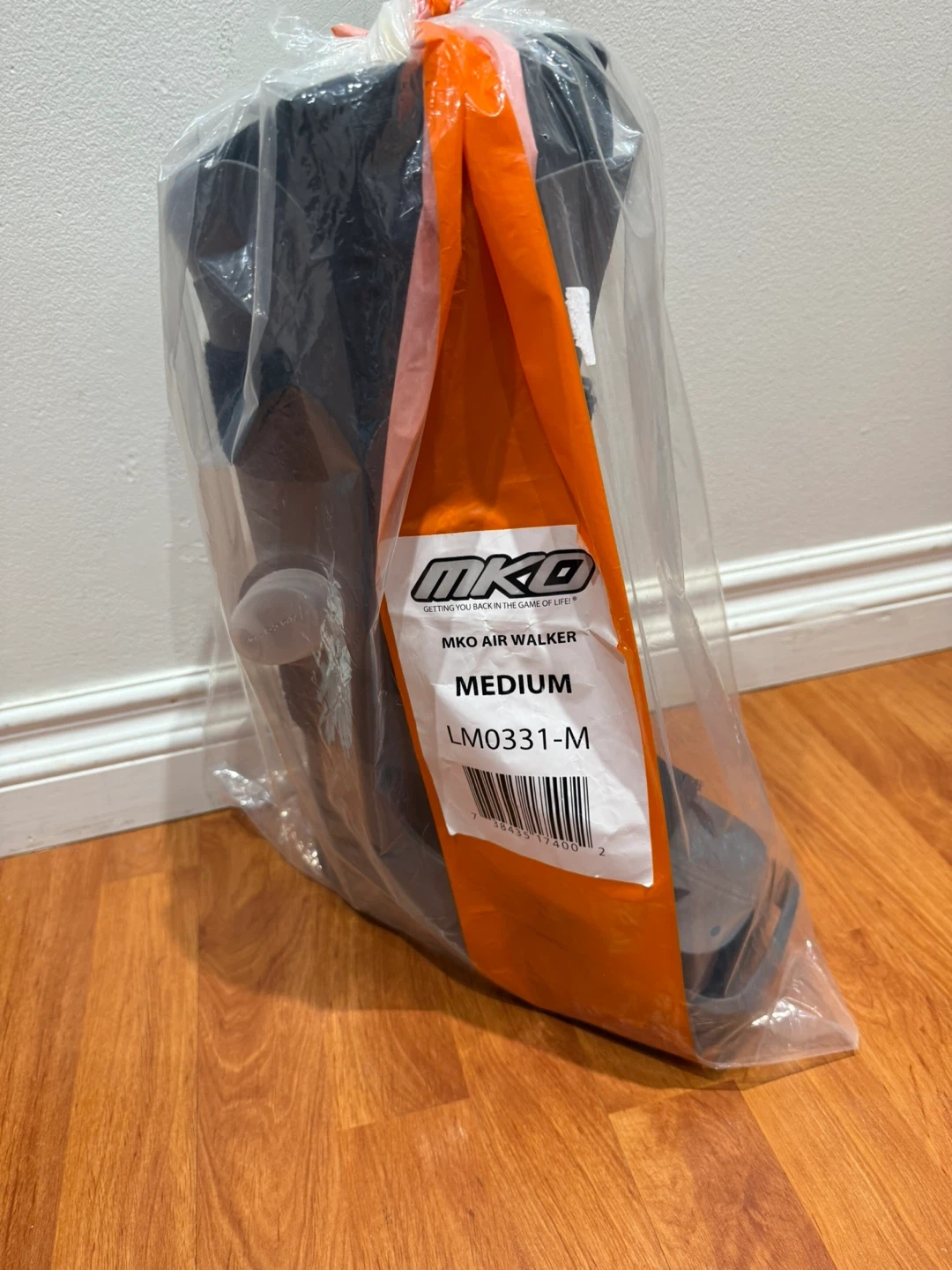 MKO Sprint Air Walker. Size medium. Features air bladders and adjustable straps. Includes instructions. Used twice. In great condition. Purchased for $200.
