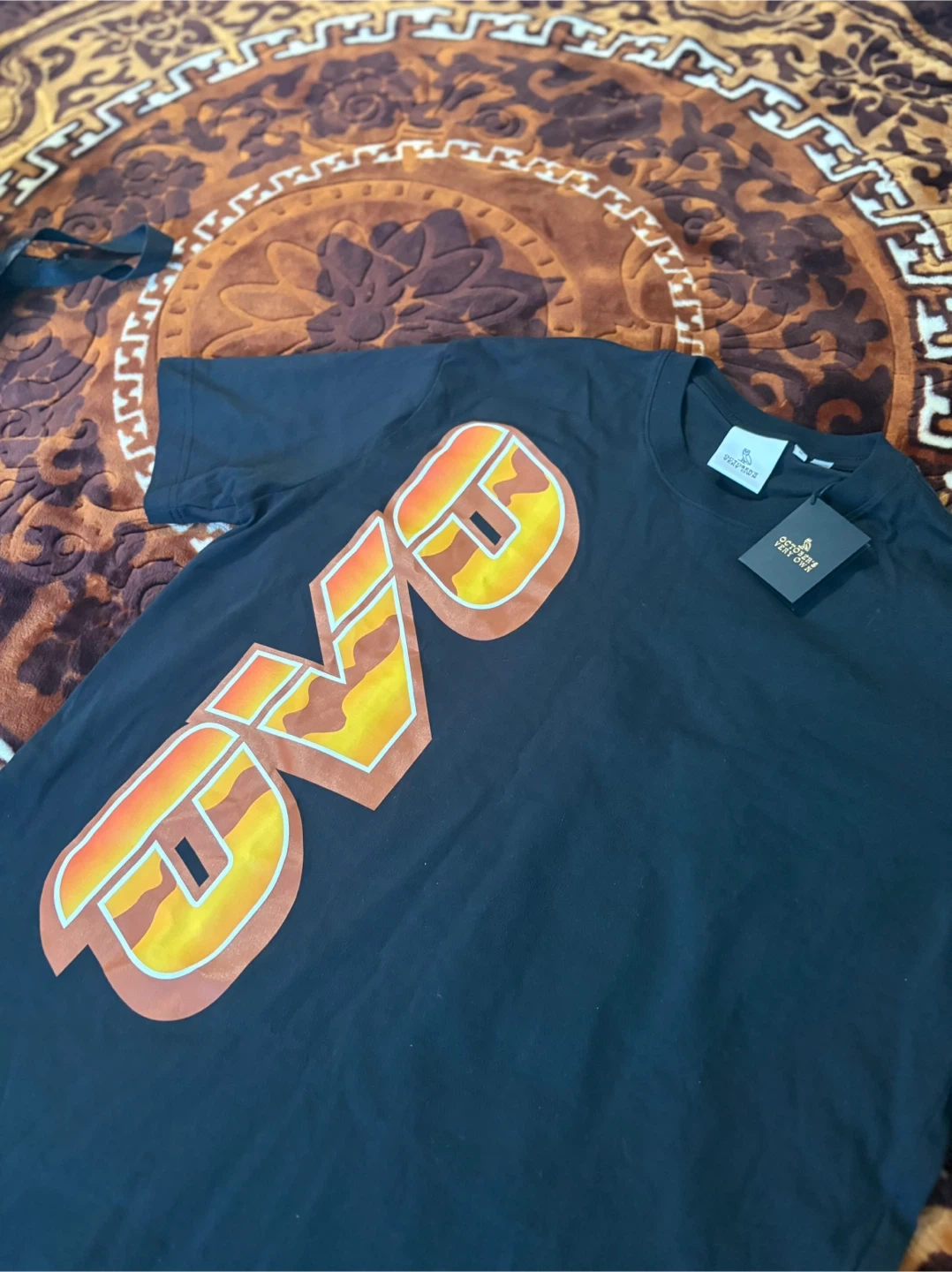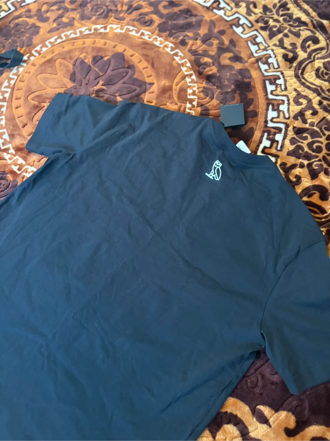 Black OVO t-shirt with a large "OVO" graphic on the front. It features the October's Very Own owl logo on the back. Size medium. It is a limited edition T-shirt. If you’re interested let me know. I can mail it to you as well as long as we agree on the payment and everything.