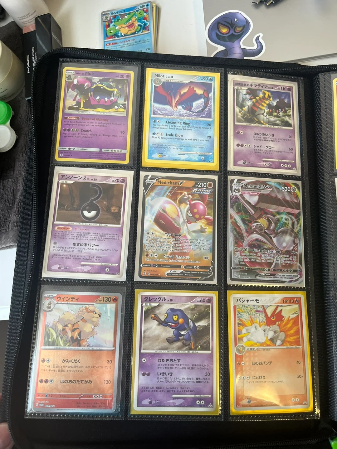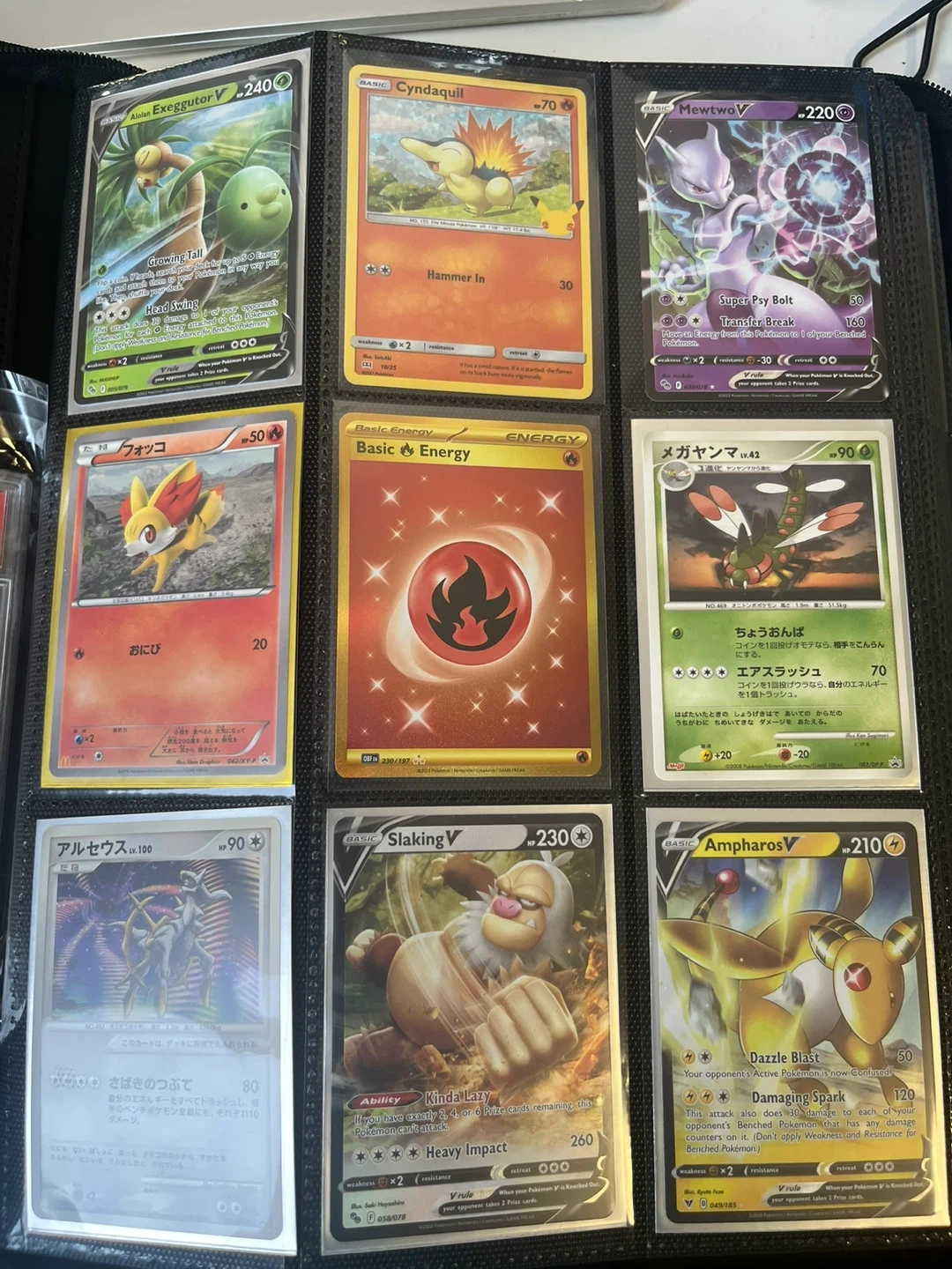 Collection of various Pokémon trading cards, including V, VMAX, GX, and basic energy cards. Also features a PSA 10 graded GuzzLord GX card. Great for collectors!