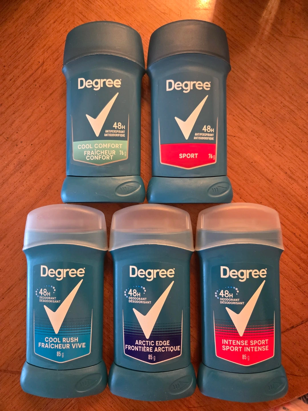 Degree antiperspirant and deodorant sticks. Includes 76g Cool Comfort, 76g Sport, 85g Cool Rush, 85g Arctic Edge, and 85g Intense Sport scents. Provides 48H protection.