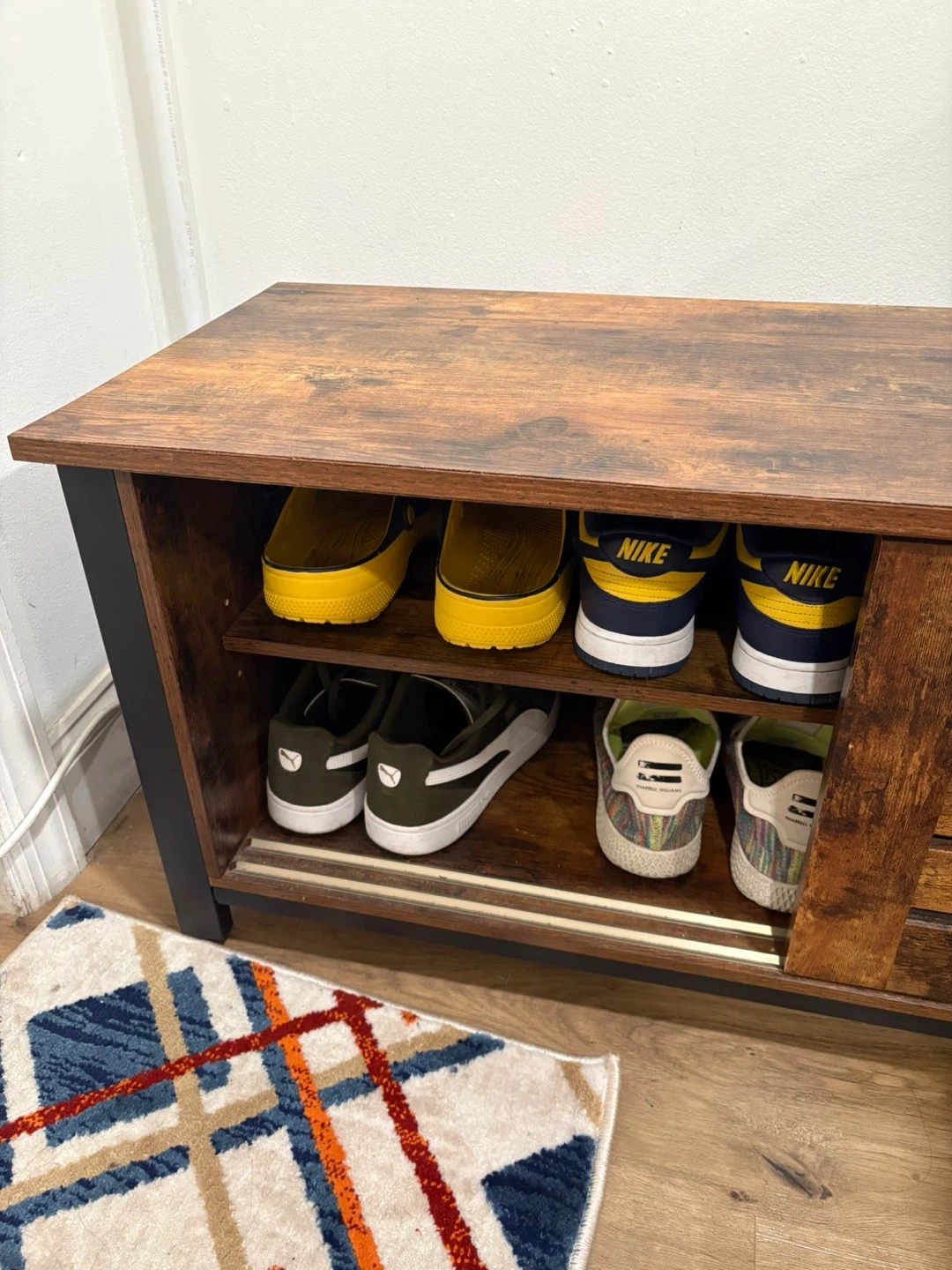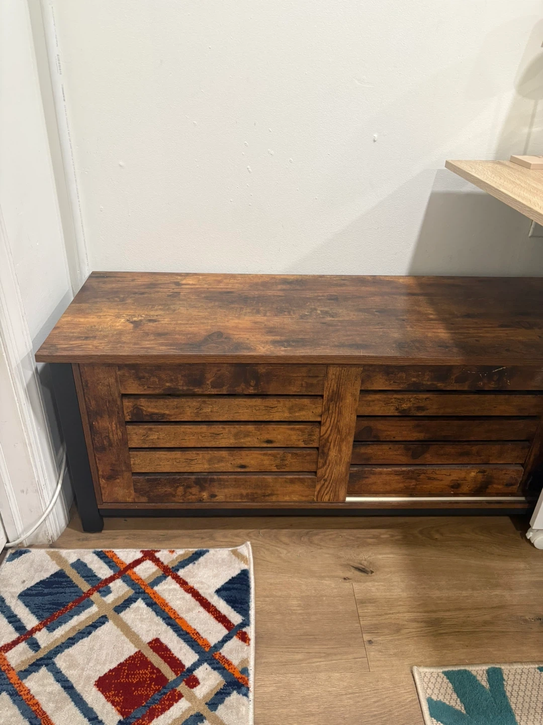 A rustic wood tv stand/ storage unit features a warm, wood-grain finish with sliding barn-style doors. It offers ample storage for electronics or other household items. It's a versatile cabinet that can fit into various decor styles! A bit banged up but the price reflects the value accordingly. Shoes not included.