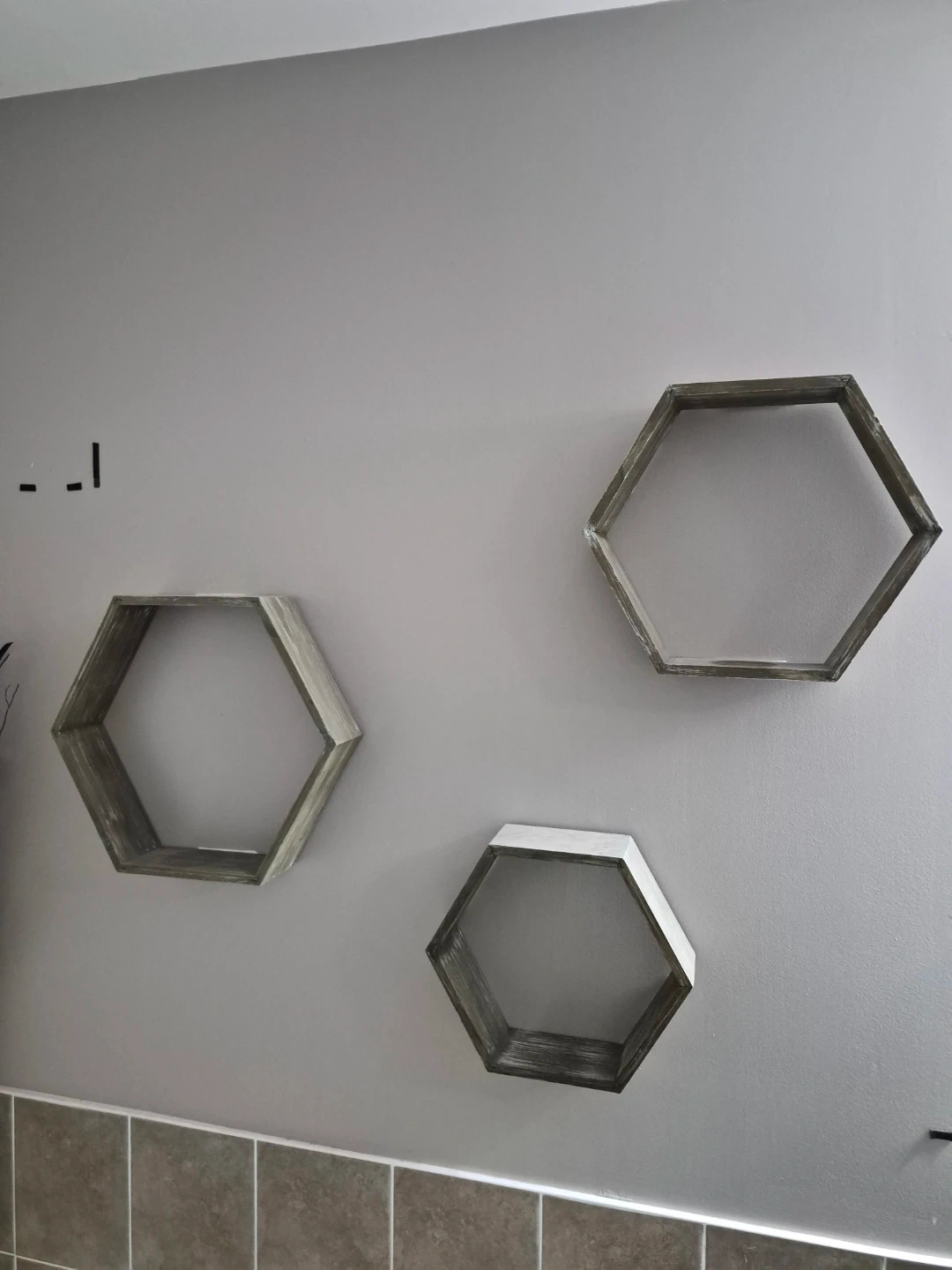 Set includes 3 hexagon boxes and 3 small shelves. Made from rustic wood with a grey wash finish. Hexagon dimensions vary from 12.5 to 16.5 inches. Small shelf dimensions are 7.5 to 9.5 inches long.