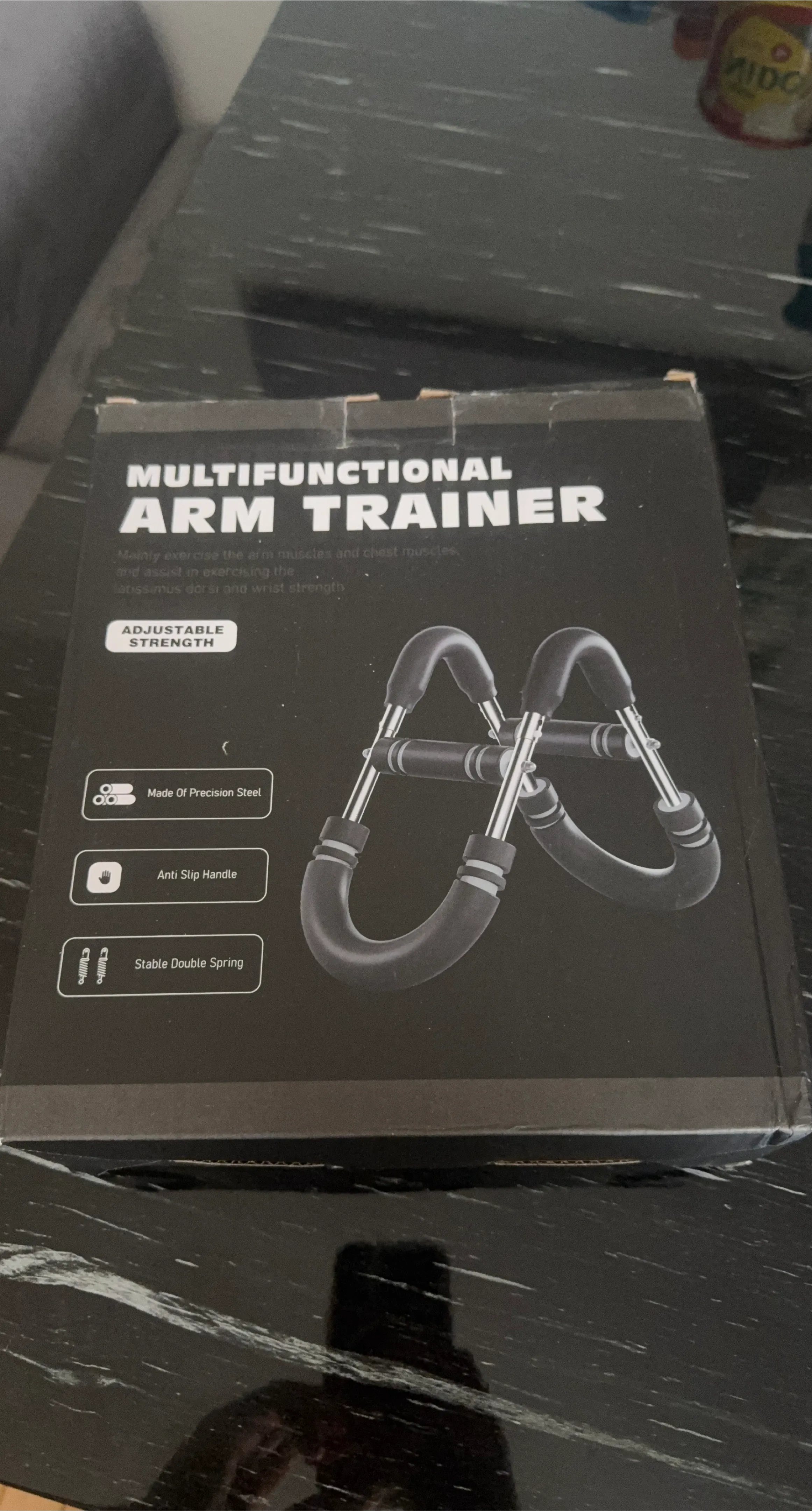 This is a multifunctional arm trainer. It's made of precision steel with anti-slip handles and a stable double spring. The strength is adjustable.
