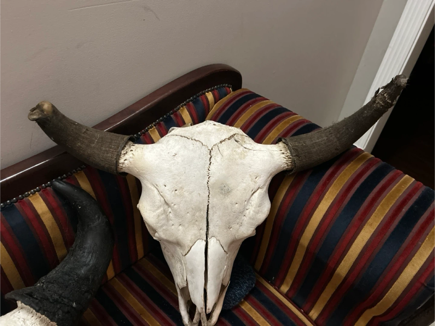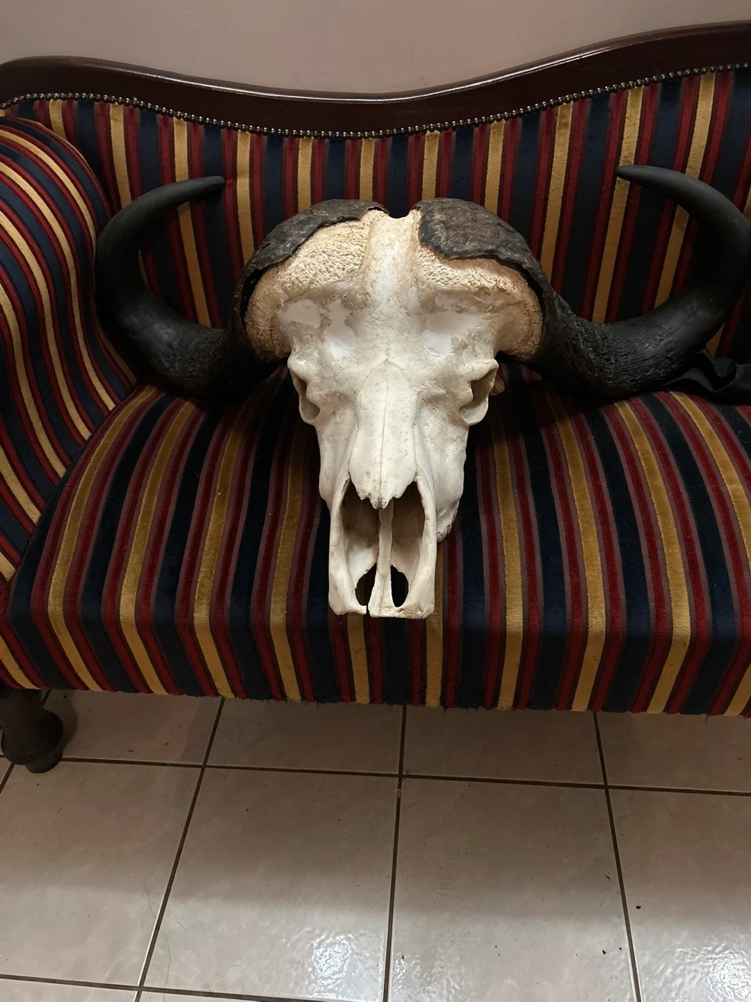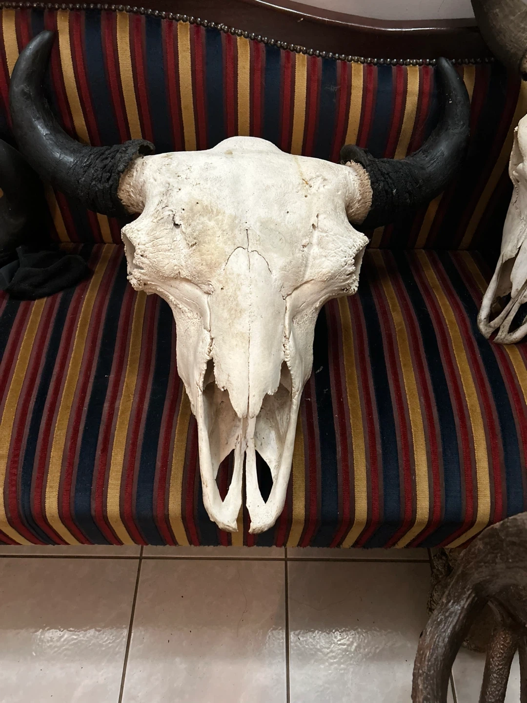 Authentic bison skull with impressive horns. It's a striking decorative piece for any space. Bone material, natural colour.