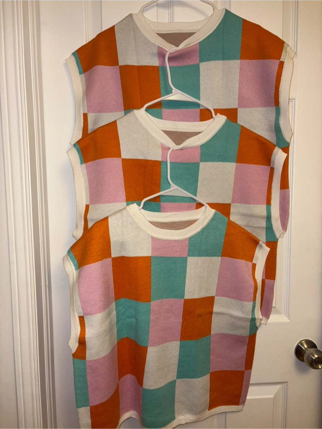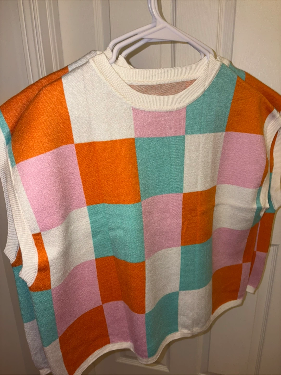 It features a colourful checkered pattern in shades of pink, orange, white, and turquoise. Perfect for layering or wearing on its own!