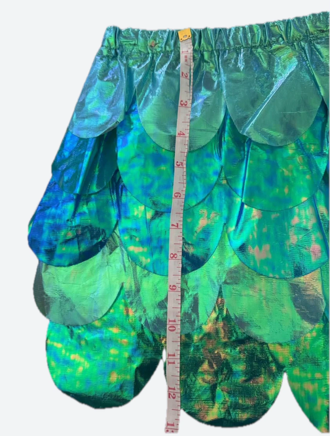 It's sized for 0-6 months. The costume features a cute scale pattern and a shimmering tail.