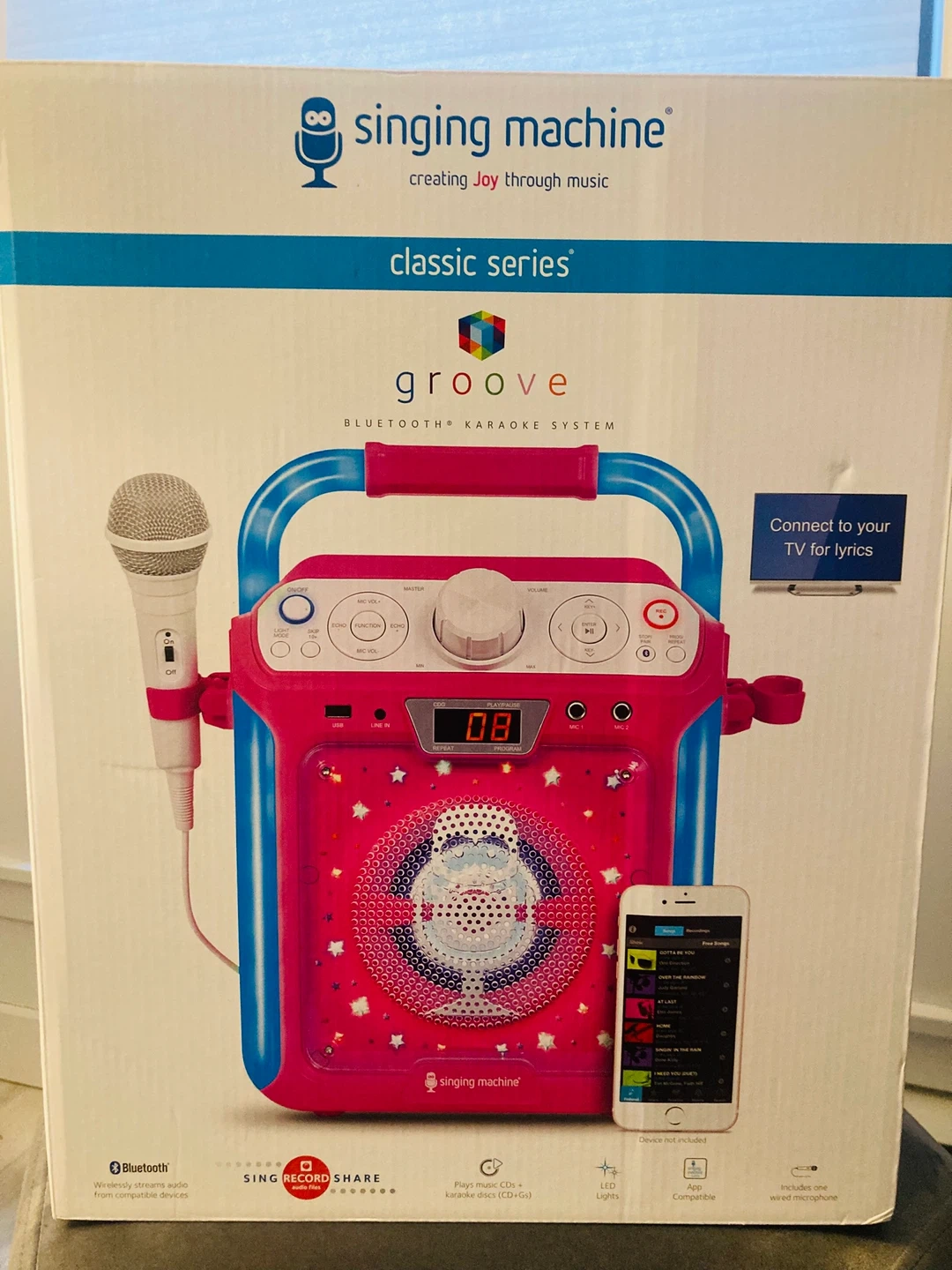 Singing Machine Groove Bluetooth karaoke system with one wired microphone. Streams audio from any Bluetooth-compatible device. Includes RCA output jacks to connect to your TV for lyrics. Built-in speaker for a dynamic sound experience.