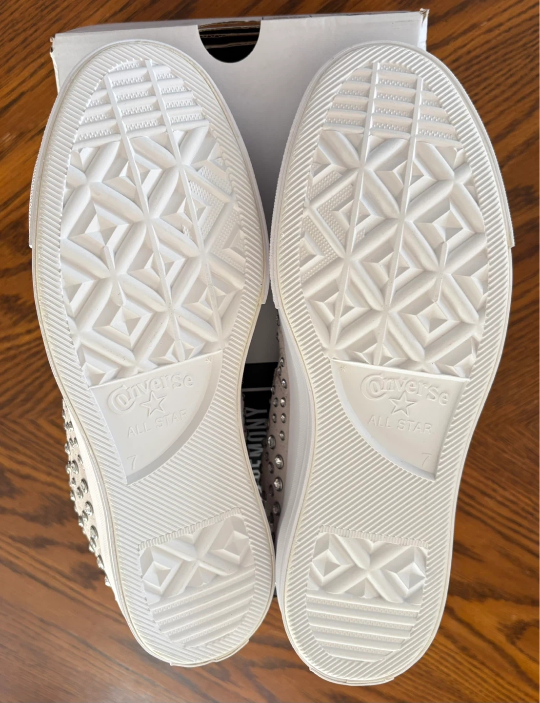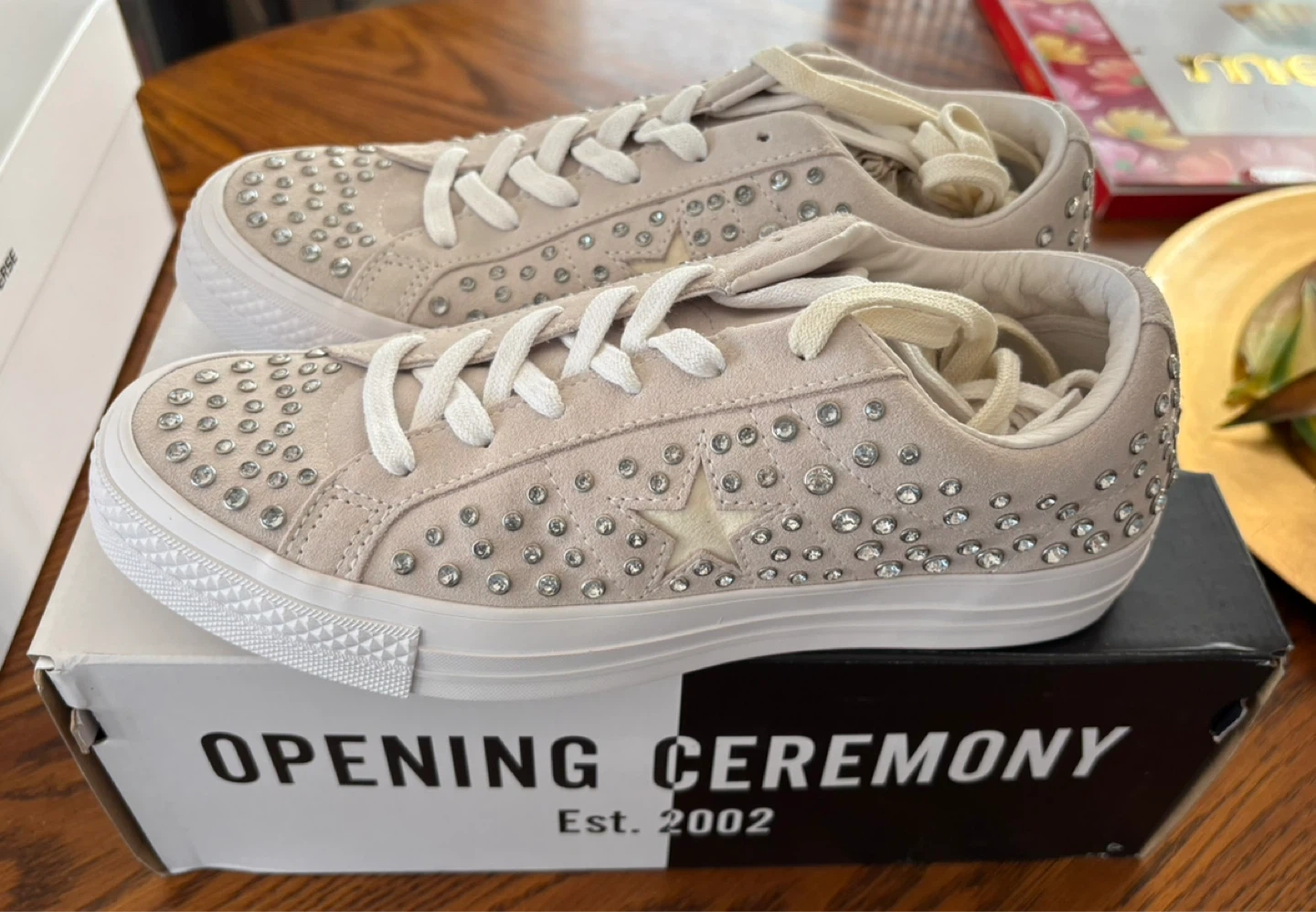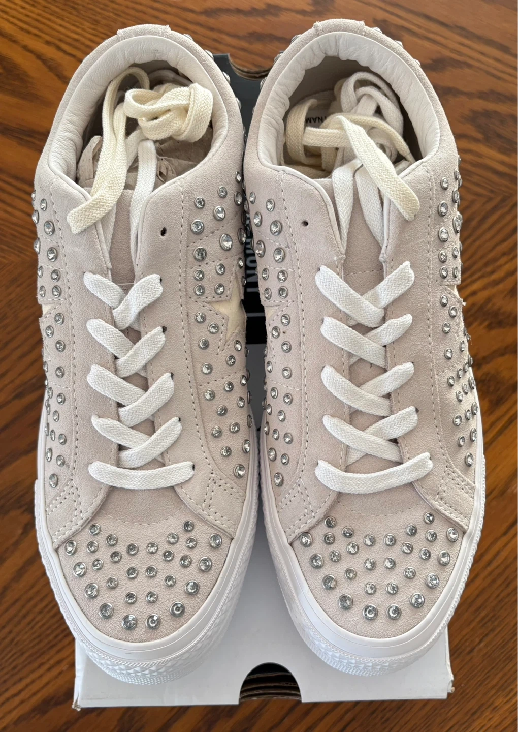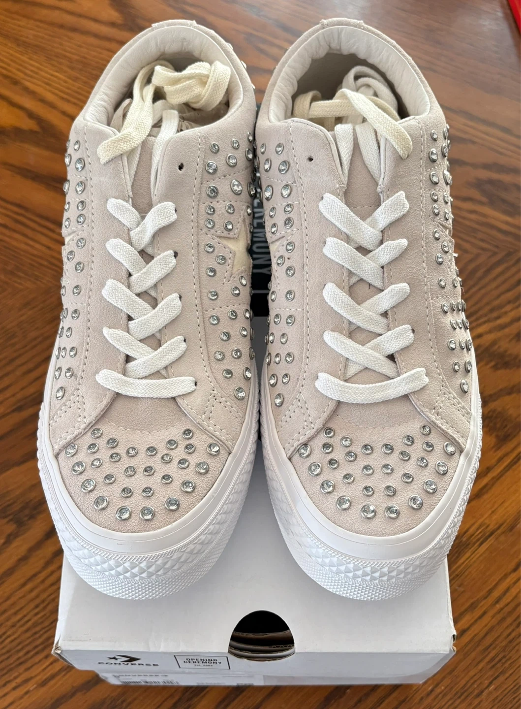 These Converse One Star sneakers are a collaboration with Opening Ceremony. They feature a light tan suede upper with all-over silver-tone stud detailing. Includes original box. These are a stylish statement shoe! Price is firm 😊