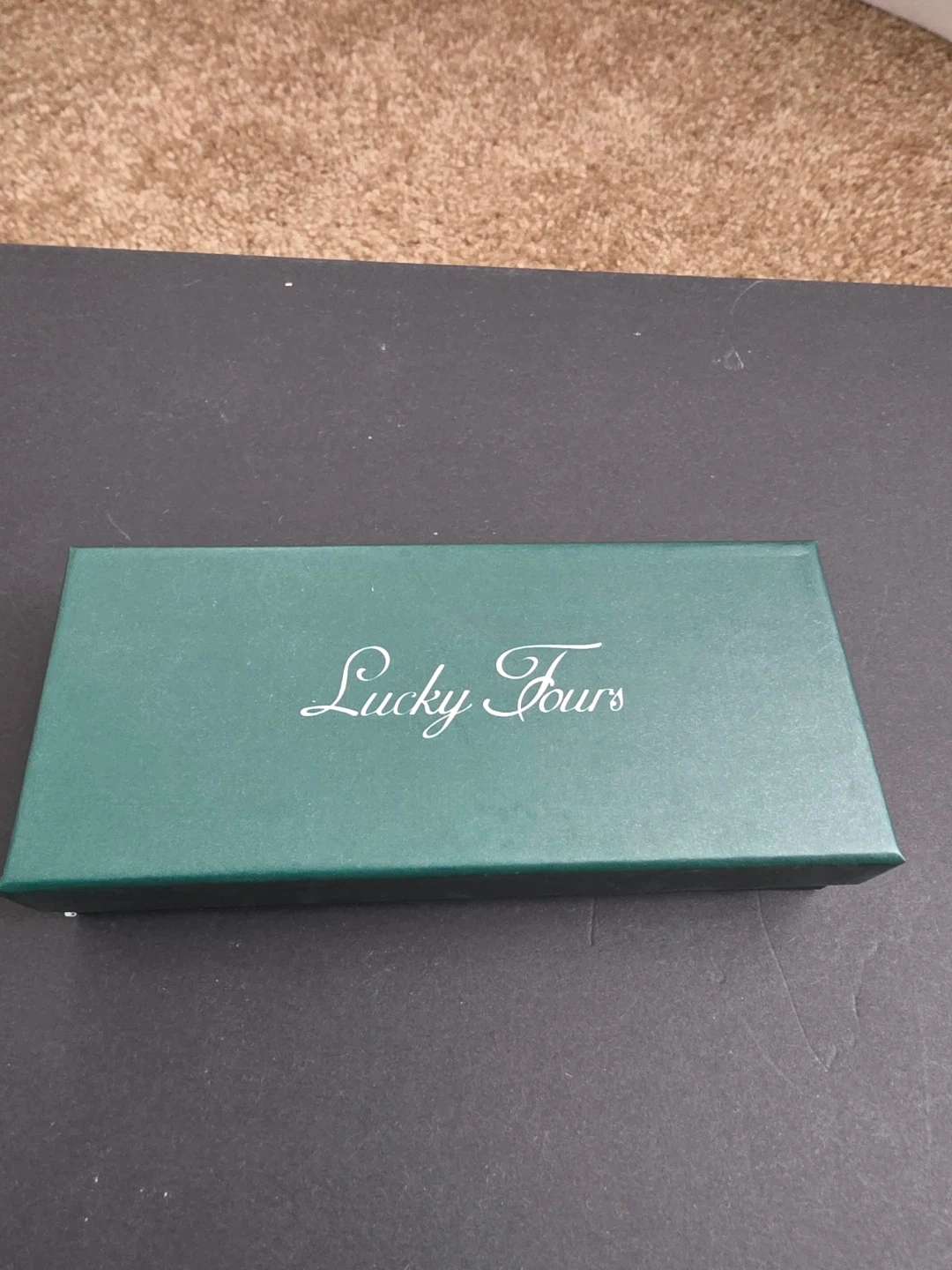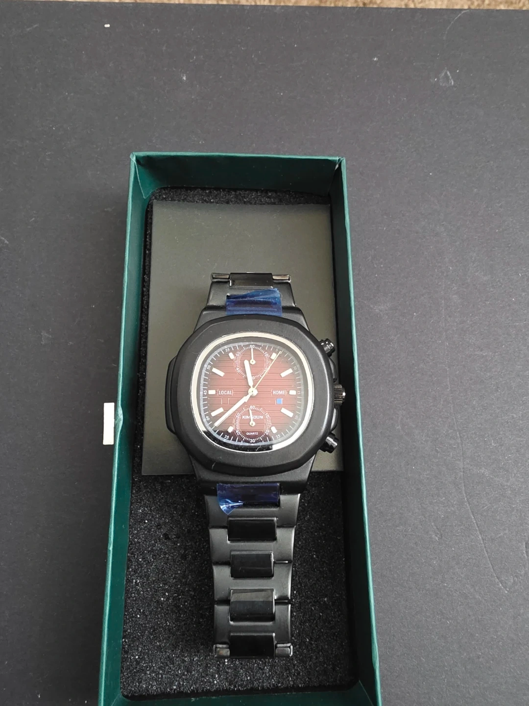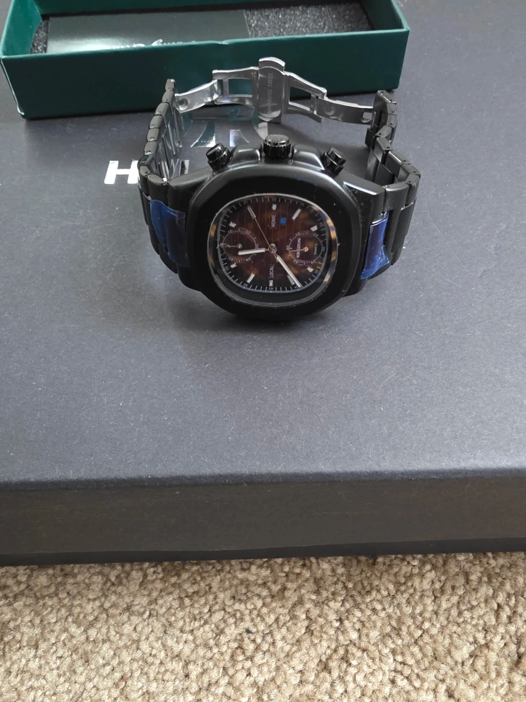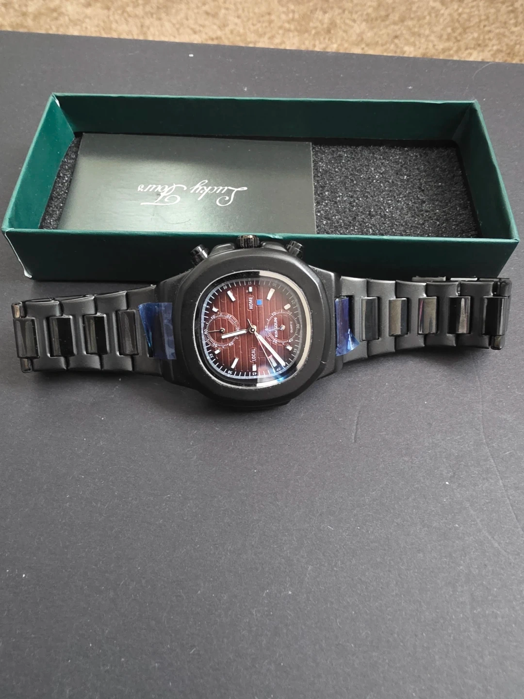 This is a black chronograph watch from Lucky Fours. It comes with its original box and packaging. The watch features a classic analog display with multiple sub-dials.