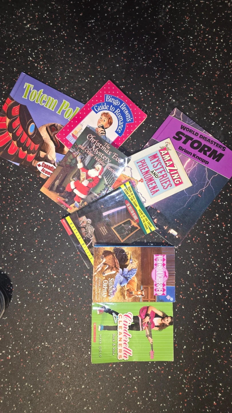 Includes 'Bingo Brown's Guide to Romance', 'The Christmas Eve Mystery', 'World Disasters: Storm', 'Amazing Mysteries and Phenomena', 'Shining Orphan', and 'Cinderella Cleaners'. Books are suitable for young readers.