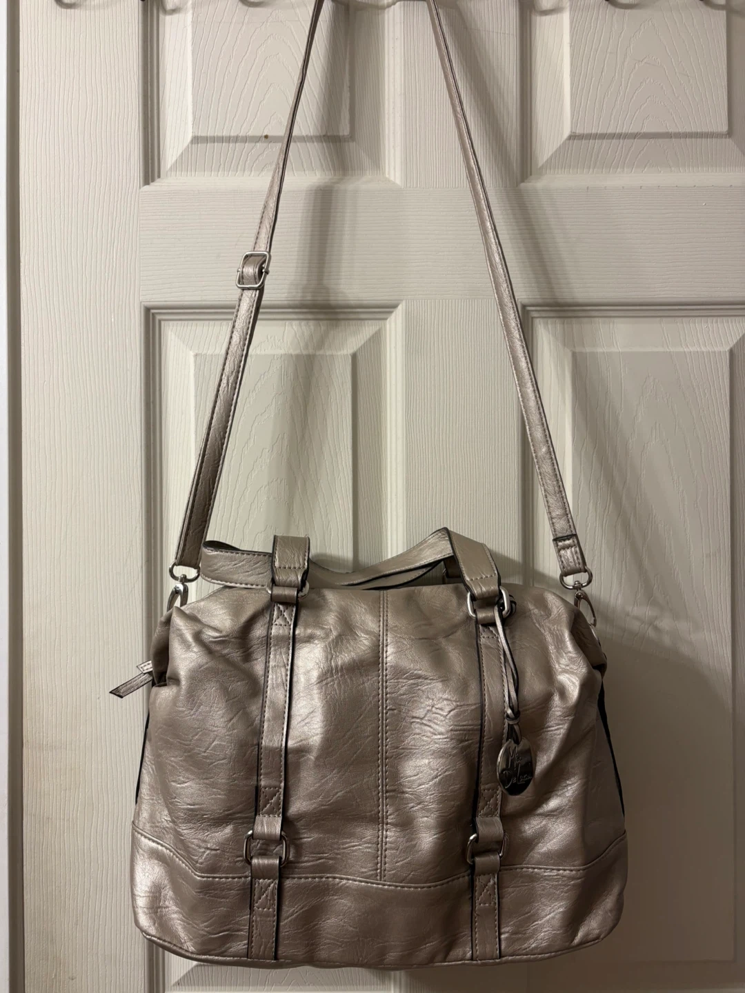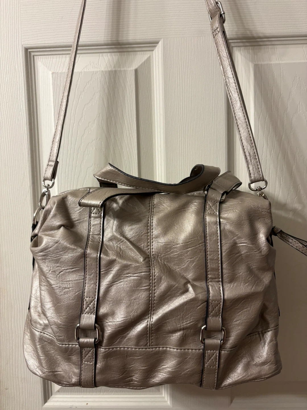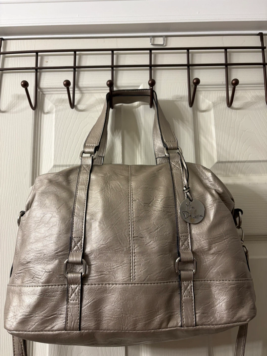 This stylish metallic silver shoulder bag by Mia Deluca is made from a faux leather material. It features both top handles and a detachable shoulder strap for versatile carrying. The bag's metallic finish adds a touch of shine to any outfit. It’s in great condition, just like new! Really spacious handbag! Pick up in Chestermere.