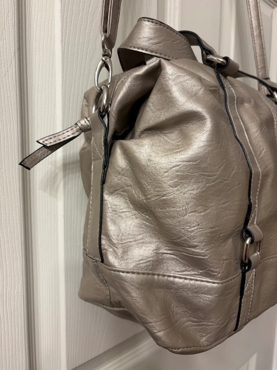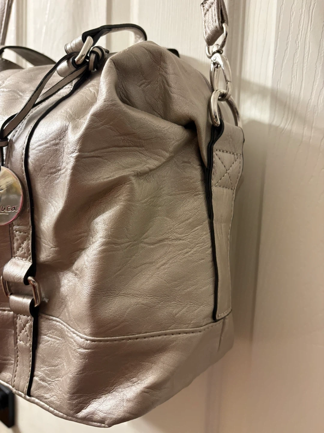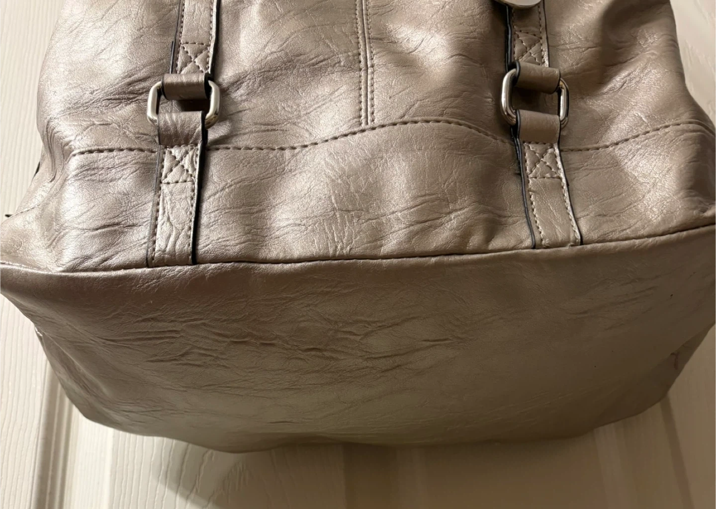 This stylish metallic silver shoulder bag by Mia Deluca is made from a faux leather material. It features both top handles and a detachable shoulder strap for versatile carrying. The bag's metallic finish adds a touch of shine to any outfit. It’s in great condition, just like new! Really spacious handbag! Pick up in Chestermere.