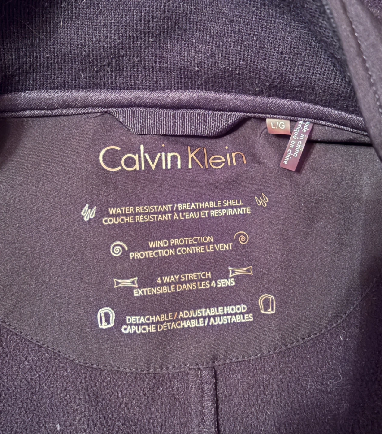 This Calvin Klein jacket is perfect for those drizzly days! It's a size L and features a detachable and adjustable hood. The jacket is water-resistant and breathable, with a 4-way stretch for extra comfort. It also offers wind protection, so you'll stay cozy no matter the weather! Pick up is in Burlington.