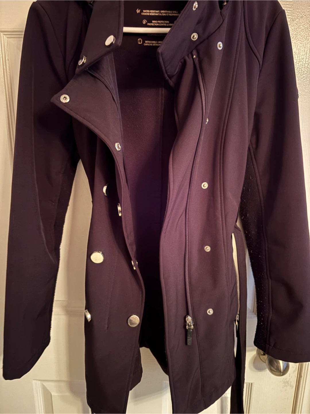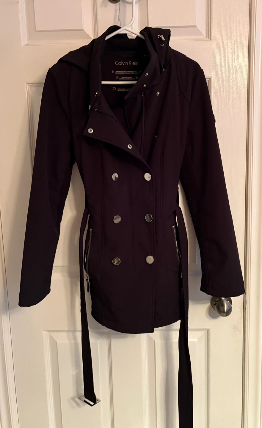 This Calvin Klein jacket is perfect for those drizzly days! It's a size L and features a detachable and adjustable hood. The jacket is water-resistant and breathable, with a 4-way stretch for extra comfort. It also offers wind protection, so you'll stay cozy no matter the weather! Pick up is in Burlington.
