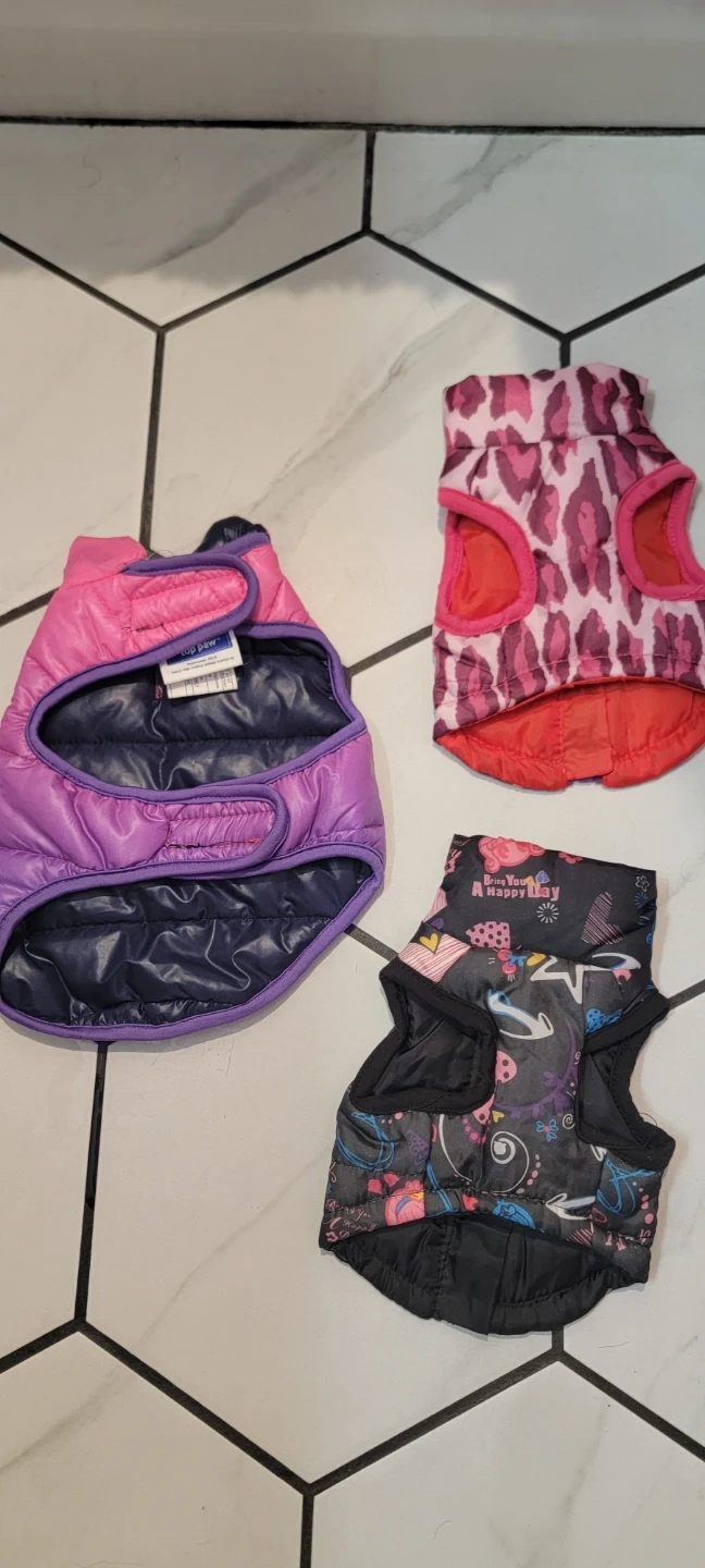 Bundle includes three dog vests in various styles and colors. One is a purple and pink ombre puffer vest with velcro. Another features a pink and black leopard print is a zip up with harness. The third is black with colorful graphics zip up with harness. These vests offer warmth and style for your pet.