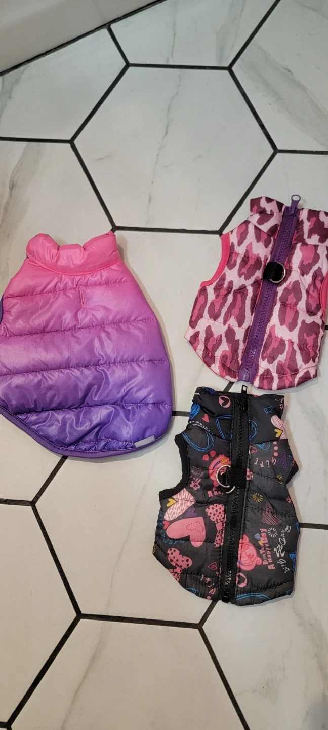 Bundle includes three dog vests in various styles and colors. One is a purple and pink ombre puffer vest with velcro. Another features a pink and black leopard print is a zip up with harness. The third is black with colorful graphics zip up with harness. These vests offer warmth and style for your pet.