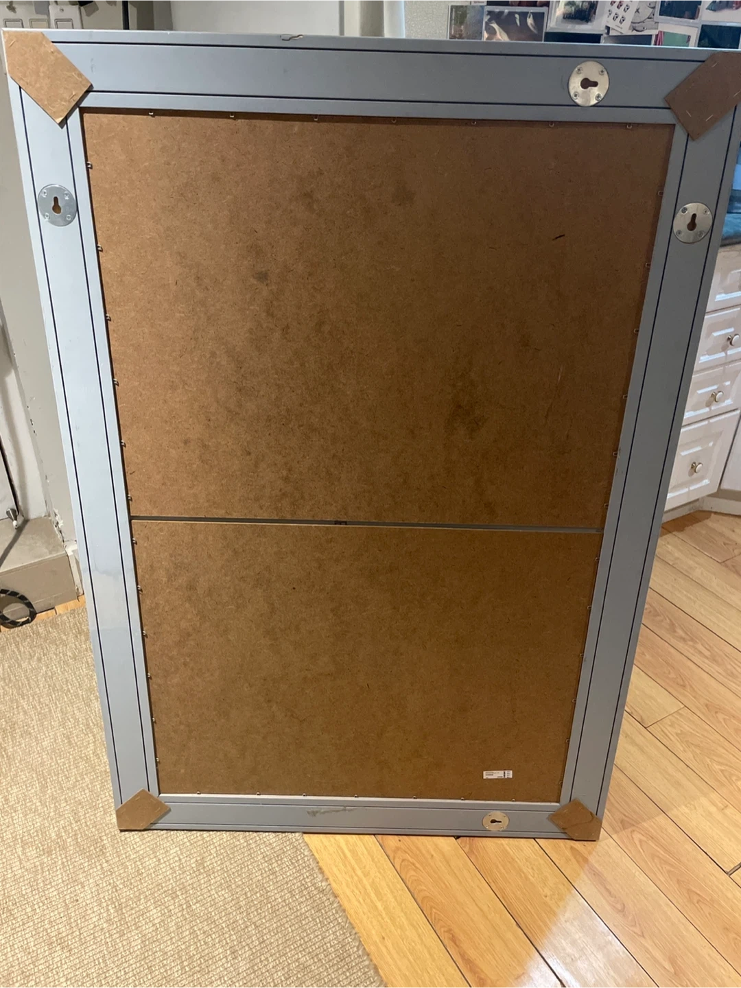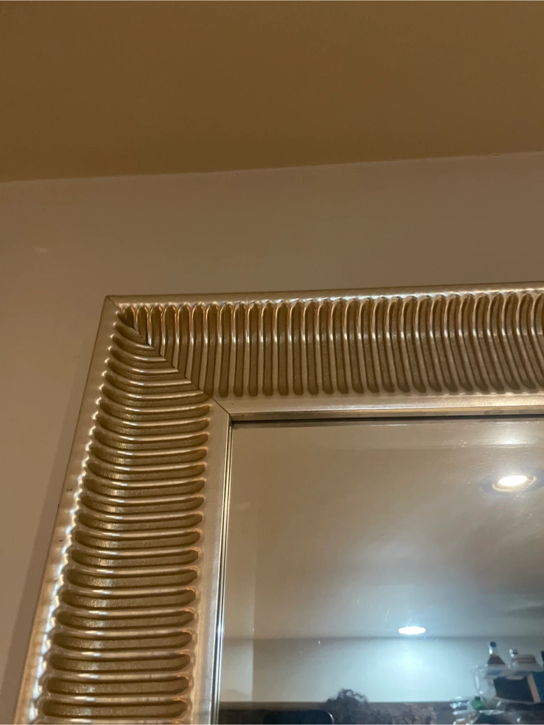 A large IKEA (SONGE) vintage decorative mirror featuring a textured silver/gold-toned frame. Fancy ribbed texture on sides. Can be hung vertically or diagonally. Measures approximately 51" x 36" and 1”deep.