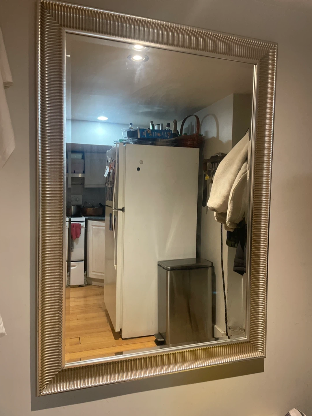 A large IKEA (SONGE) vintage decorative mirror featuring a textured silver/gold-toned frame. Fancy ribbed texture on sides. Can be hung vertically or diagonally. Measures approximately 51" x 36" and 1”deep.