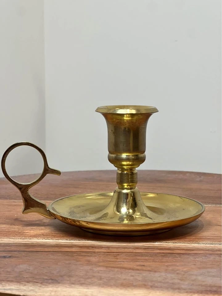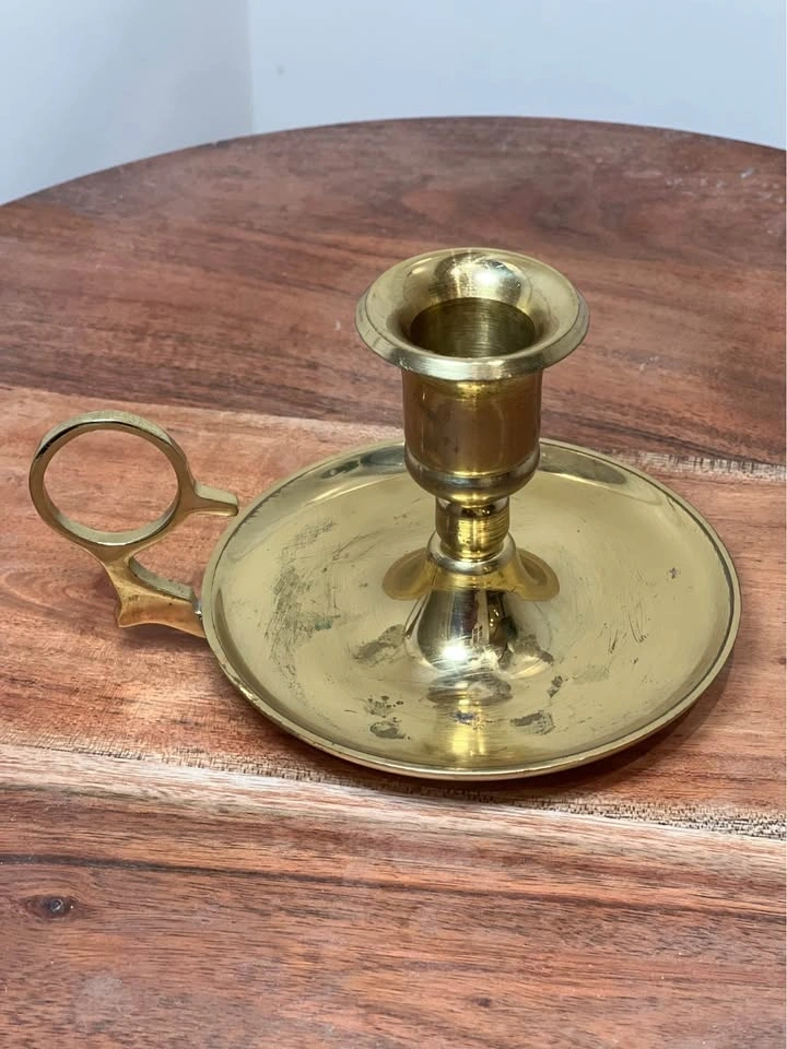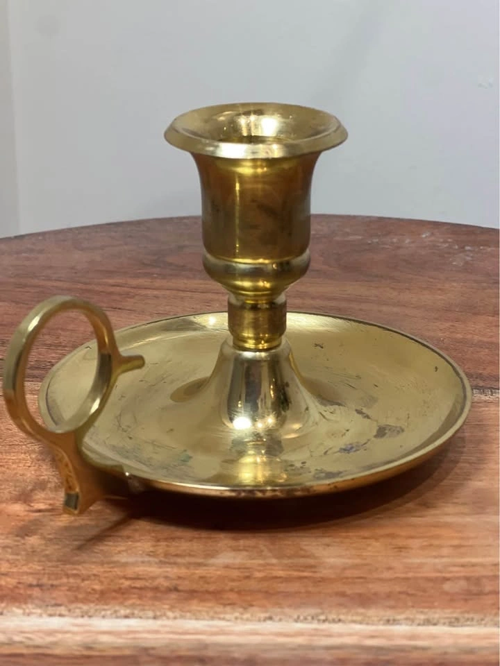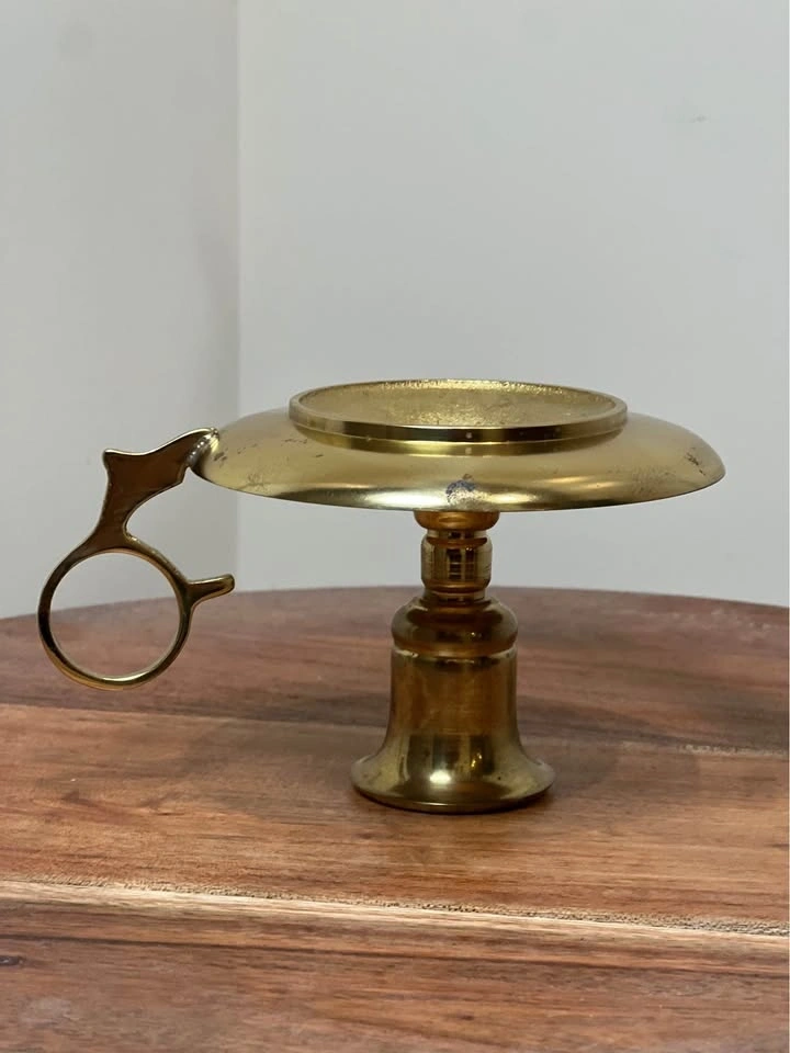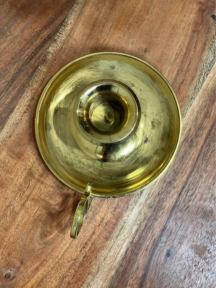 This is a vintage solid brass chamberstick, designed for portability. It features a wide base to catch wax drips and a finger loop for carrying. The screw in the center might indicate a removable candle socket or a gimbal mechanism, common in nautical-style holders. It's great for holding standard taper candles. Preowned. Pickup is 58th and 7th Ave in midtown Manhattan.