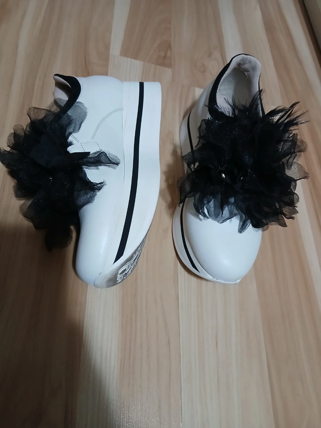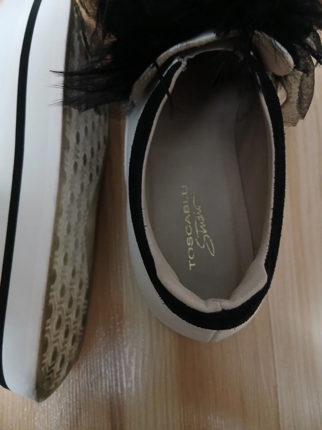 These TOSCABLƯ Studio platform shoes are white with a black ruffle and feather detail. They feature a thick platform sole. The interior shows the TOSCABLƯ Studio logo.
