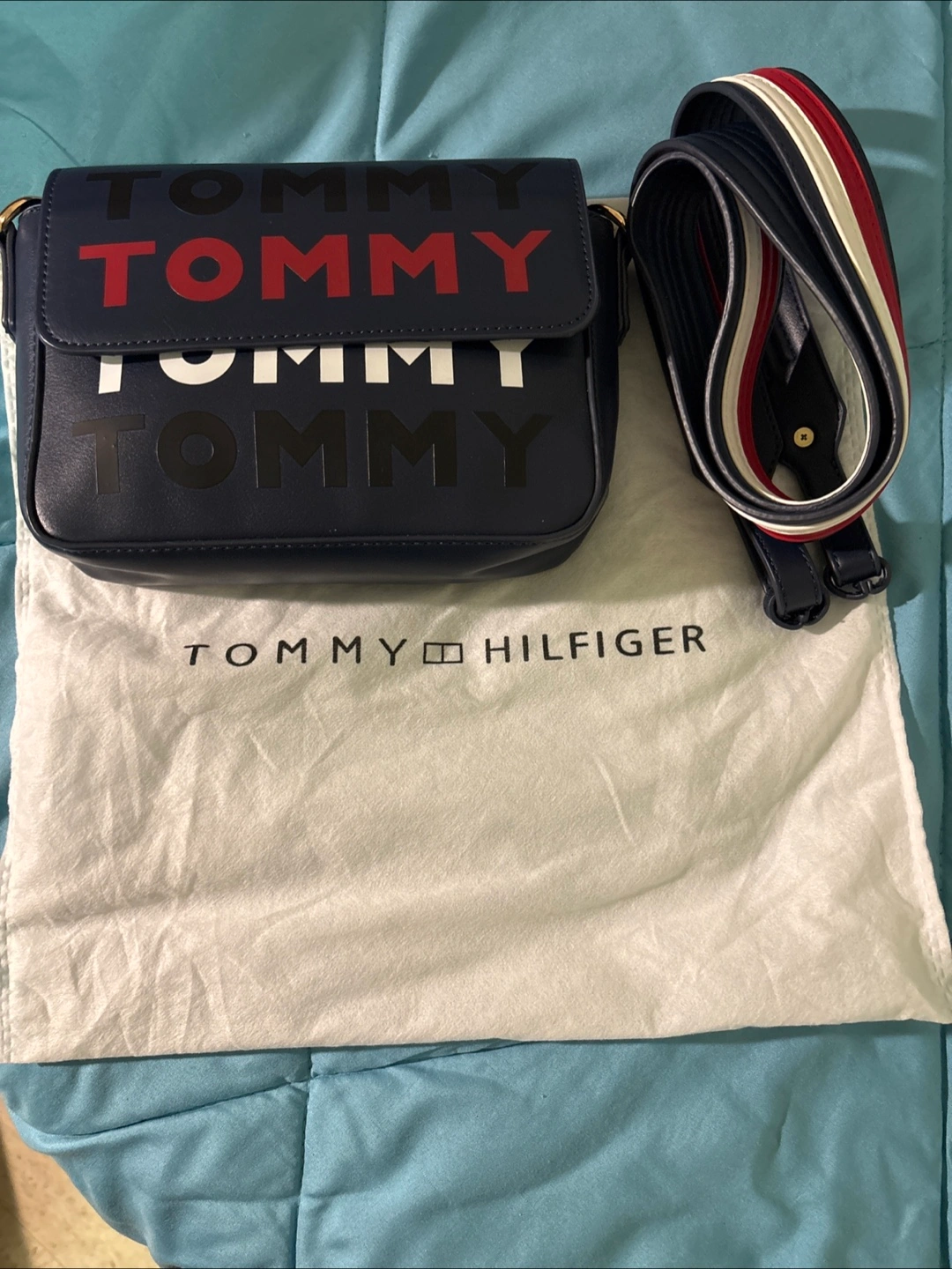 Tommy Hilfiger crossbody bag in a stylish navy colour! The bag features the Tommy Hilfiger logo in red and white. It comes with a detachable strap, and a dust bag to keep it safe when storing it away