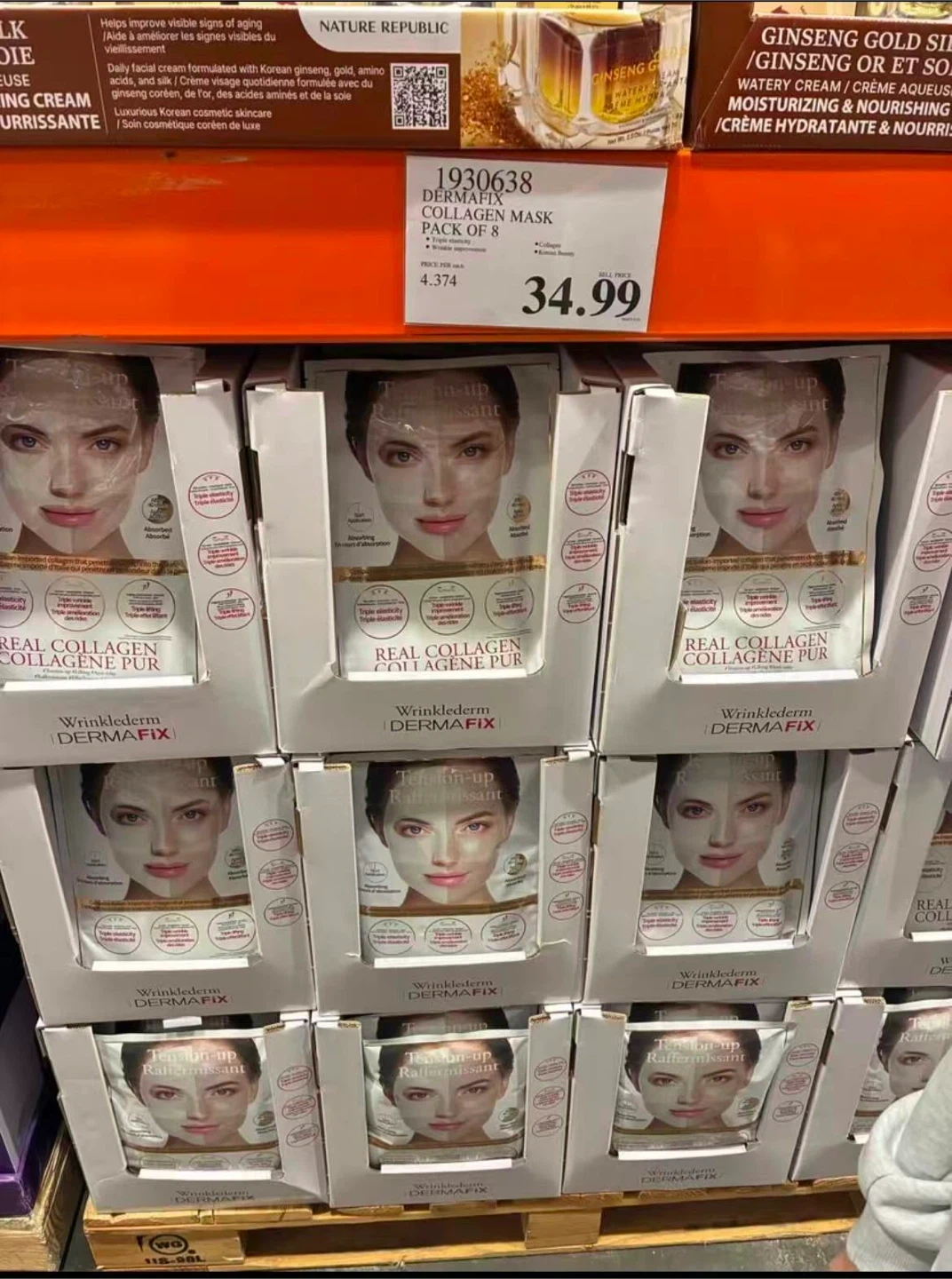 These are Dermafix Real Collagen Collagen Masks. Each pack contains 8 masks. They're formulated with Korean ginseng, gold, amino acids, and silk for a luxurious skincare experience.