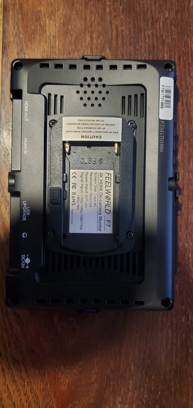 In perfect condition, used only 2-3 times. Comes with battery and HDMI cable. This FeelWorld FH7 7" monitor features a 1920 x 1200 IPS LCD panel with 323 PPI, perfect for viewing SD, HD, or UHD 4K video. It has a 1200:1 contrast ratio and 450 cd/m² brightness for easy indoor viewing. An included sun hood helps block glare for outdoor use. Key monitoring tools include histogram, focus peaking, false color, zebras, and more. Cash accepted.
