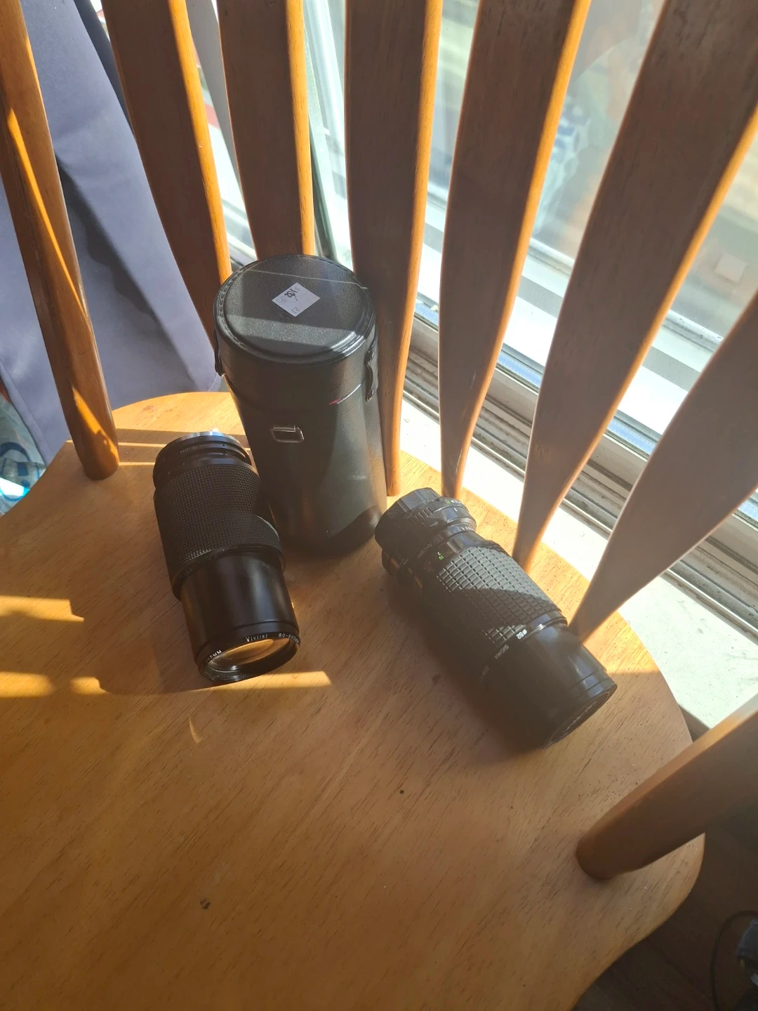 Two camera lenses, one Vivitar 80-200mm f/4 and one Sigma zoom lens. Includes a lens case. Perfect for photographers looking to expand their lens collection!