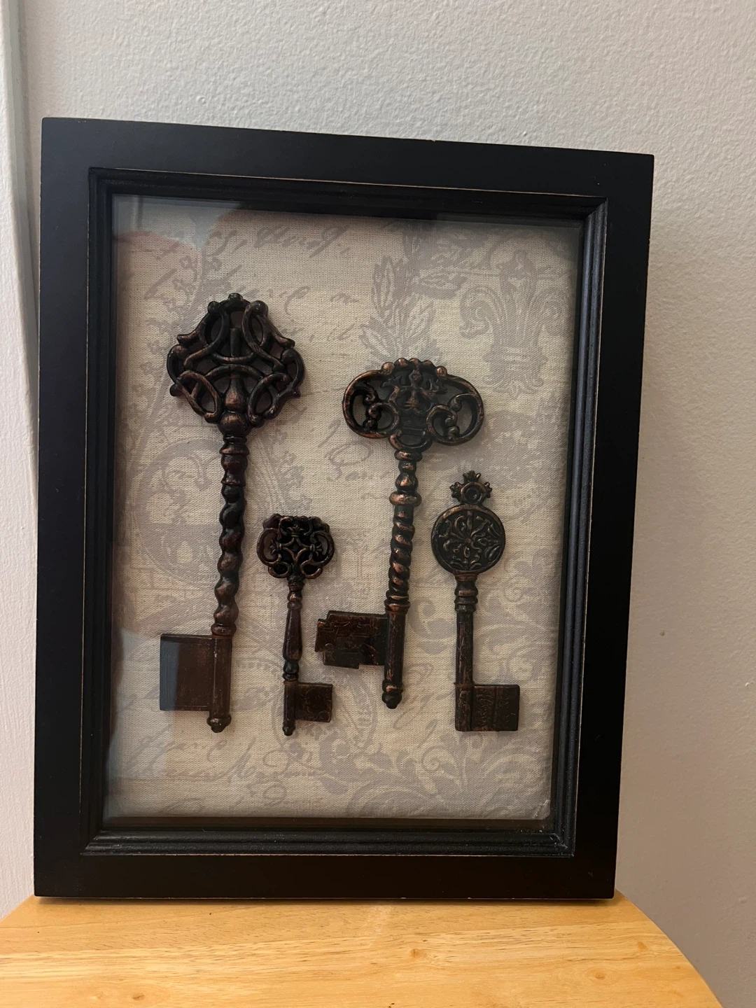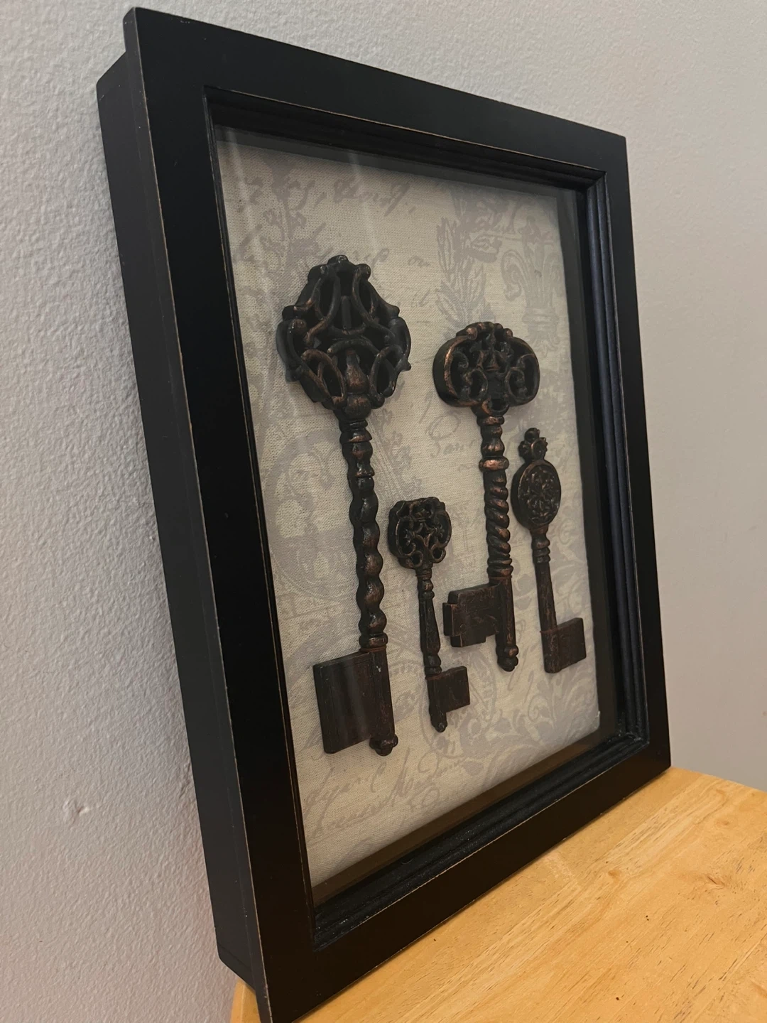 This decorative wall art features a collection of four vintage-style keys mounted on a patterned fabric background. It's housed in a black wooden frame, ready to hang. This piece adds a touch of classic charm to any room.