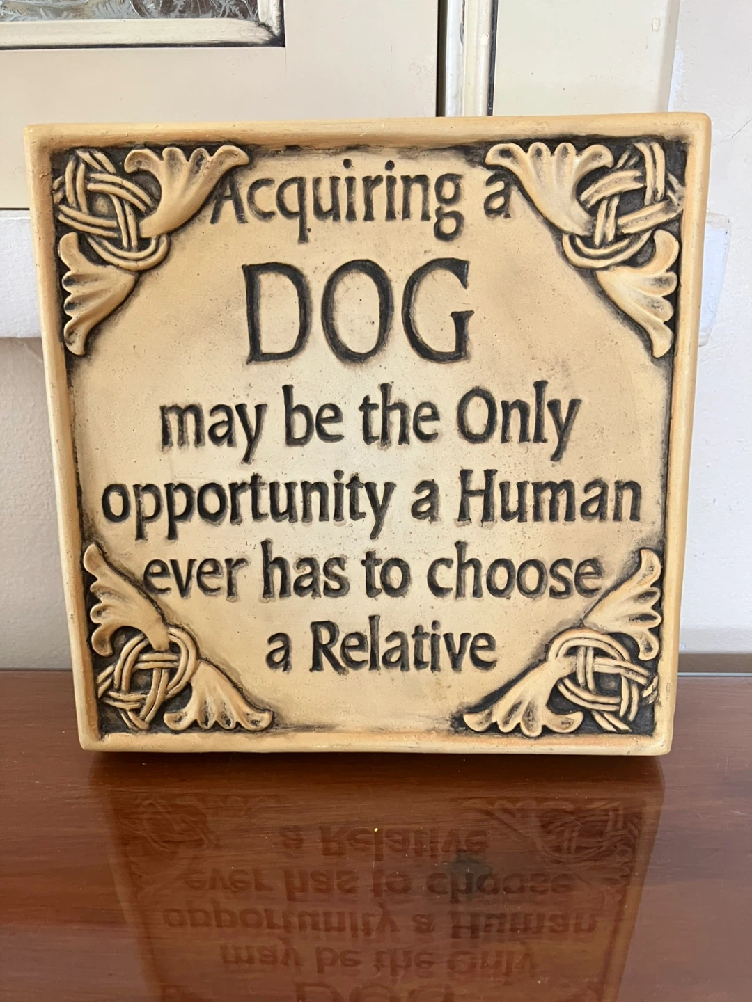 This decorative stone features the quote 'Acquiring a DOG may be the Only opportunity a Human ever has to choose a Relative'. It's made from a durable material and has an embossed design. This would make a thoughtful gift for any dog owner!