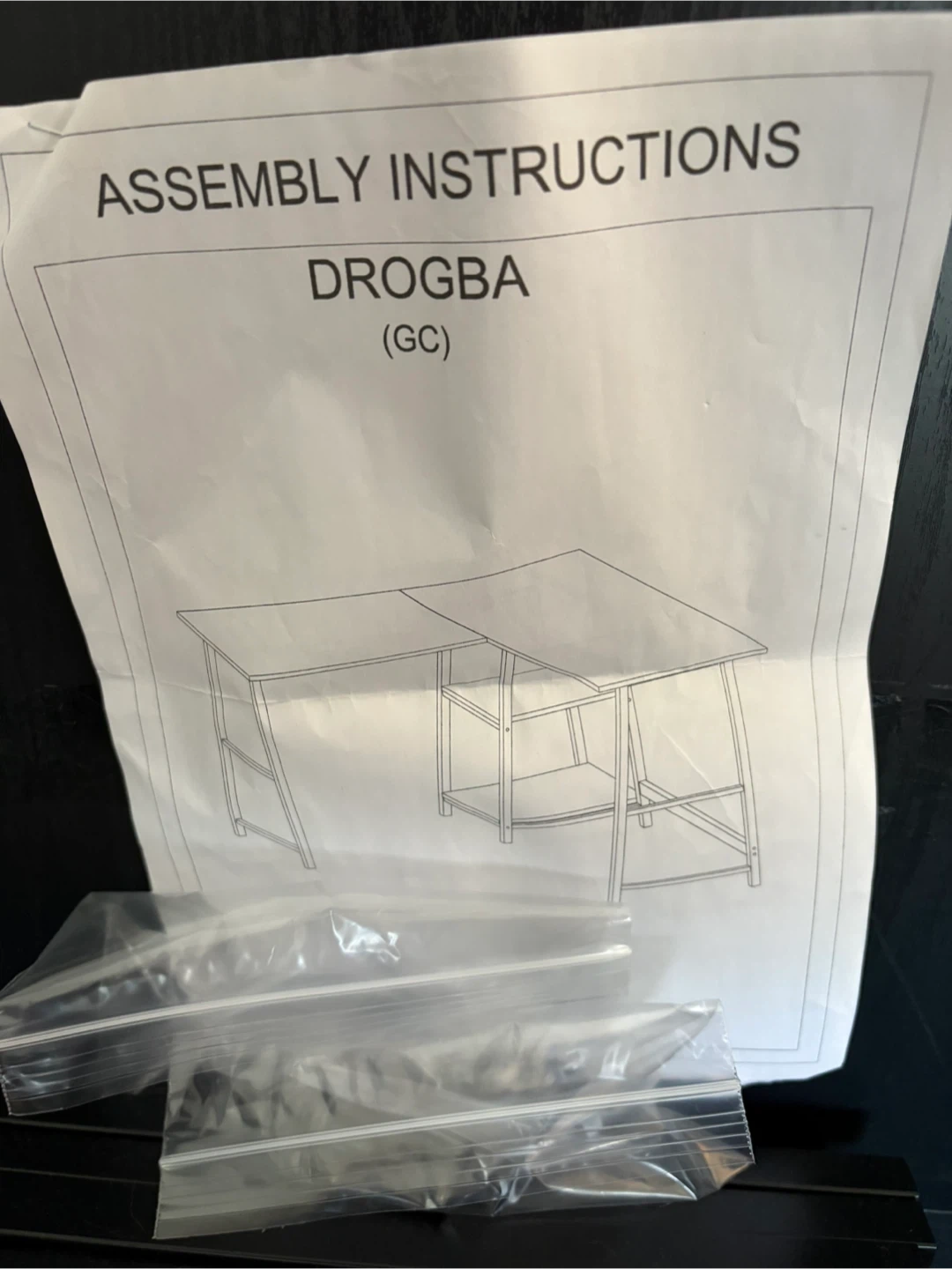 This L-shaped computer desk is black with a metal frame. It's designed with an edgy architectural look. Assembly instructions are included. All hardware is bagged and accounted for. Dis-assembled for easy transport. Has some knocks and scratches from regular use.