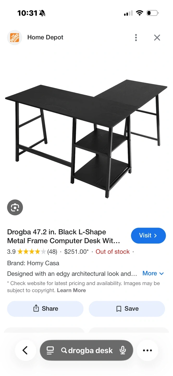 This L-shaped computer desk is black with a metal frame. It's designed with an edgy architectural look. Assembly instructions are included. All hardware is bagged and accounted for. Dis-assembled for easy transport. Has some knocks and scratches from regular use.