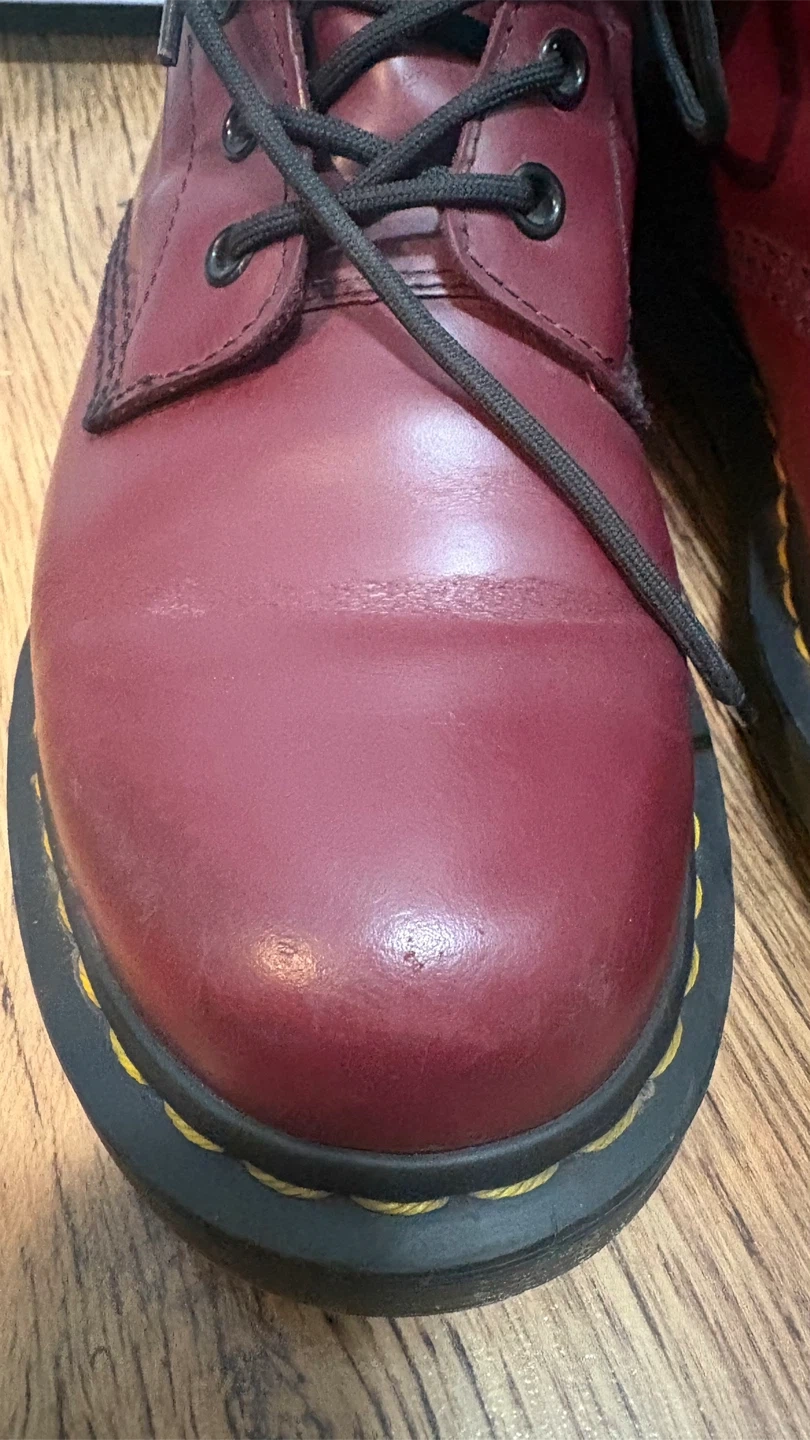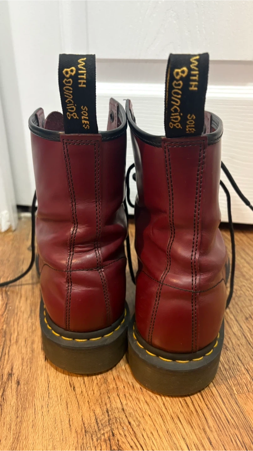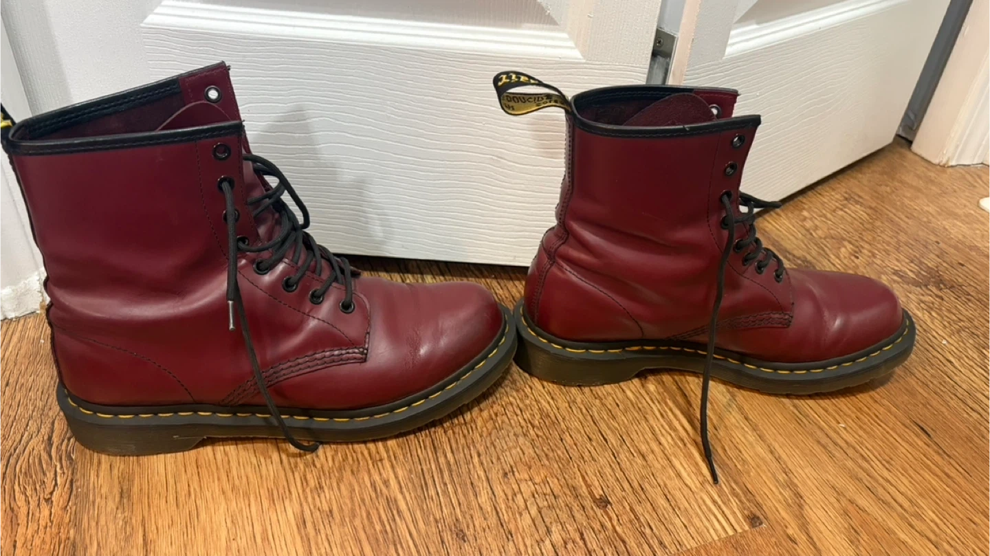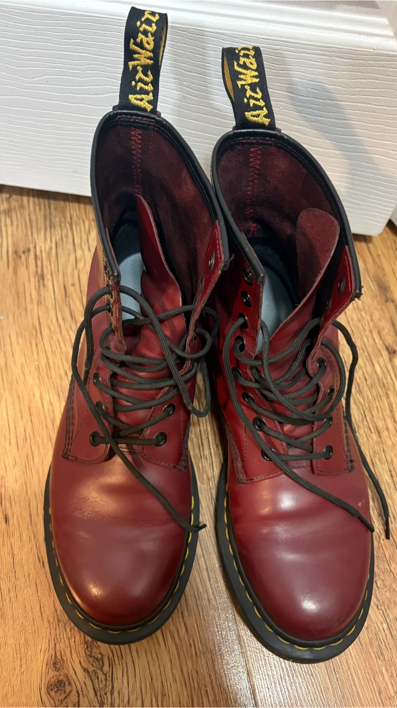 Classic Dr. Martens 1460 boots in cherry red smooth leather. These iconic lace-up boots feature the signature yellow stitching and durable air-cushioned sole. Great for everyday wear!